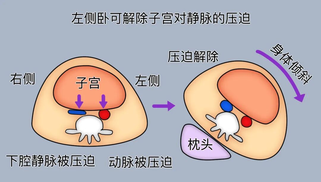 当妈妈向左侧躺卧时,重力作用使沉重的子宫自然偏向左侧,就能减轻对下腔静脉的压迫。