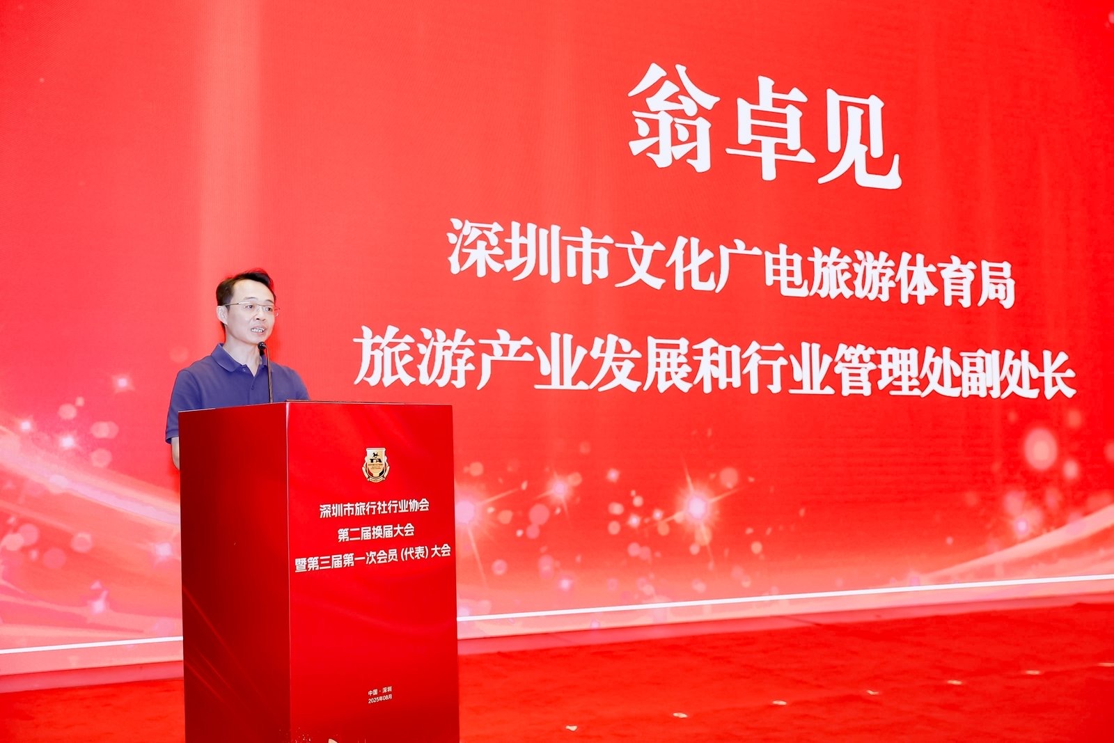 深圳市文化广电旅游体育局旅游产业发展和行业管理处副处长翁卓见对大会召开及新当选班子表示祝贺,肯定协会一直以来作为"政府助手、企业桥梁"所做的贡献,并围绕深圳建设"世界级观光旅游和休闲度假目的地城市"目标,对协会提出三点建议:一是抢抓机遇,激活新业态,提升国际服务能级;二是深化行业自律与资源整合,创新服务模式,当好政企桥梁;三是发挥智库作用,研判文体旅融合趋势,扩大会员覆盖,打造行业标杆旗帜。