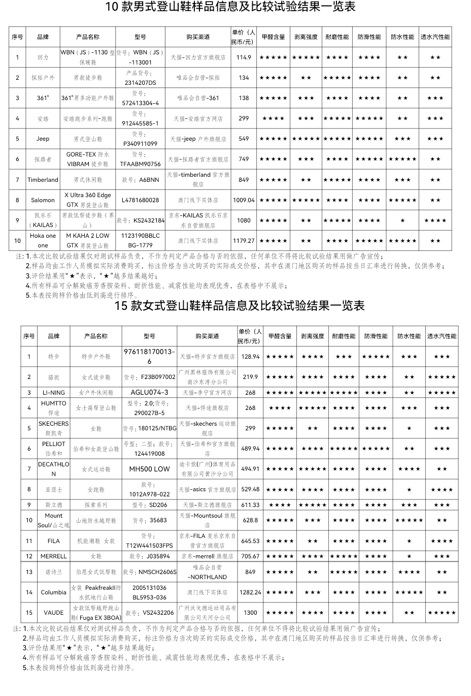 此次试验,工作人员以普通消费者的身份,从电商平台及线下实体店,共购买25款登山鞋样品(其中男式登山鞋10款,女式登山鞋15款),价格从人民币约115元/双到1300元/双不等。样品测试项目主要包括2项化学安全性能指标,分别是甲醛含量、可分解致癌芳香胺染料,以及剥离强度、耐折性能、耐磨性能、防滑性能、防水性能、透水汽性能、减震性能等7项物理使用性能指标。