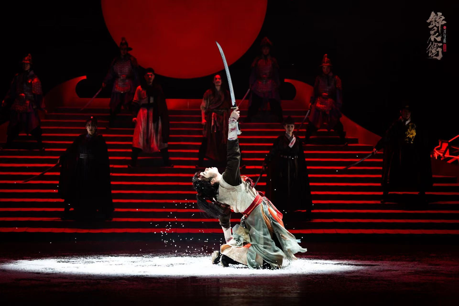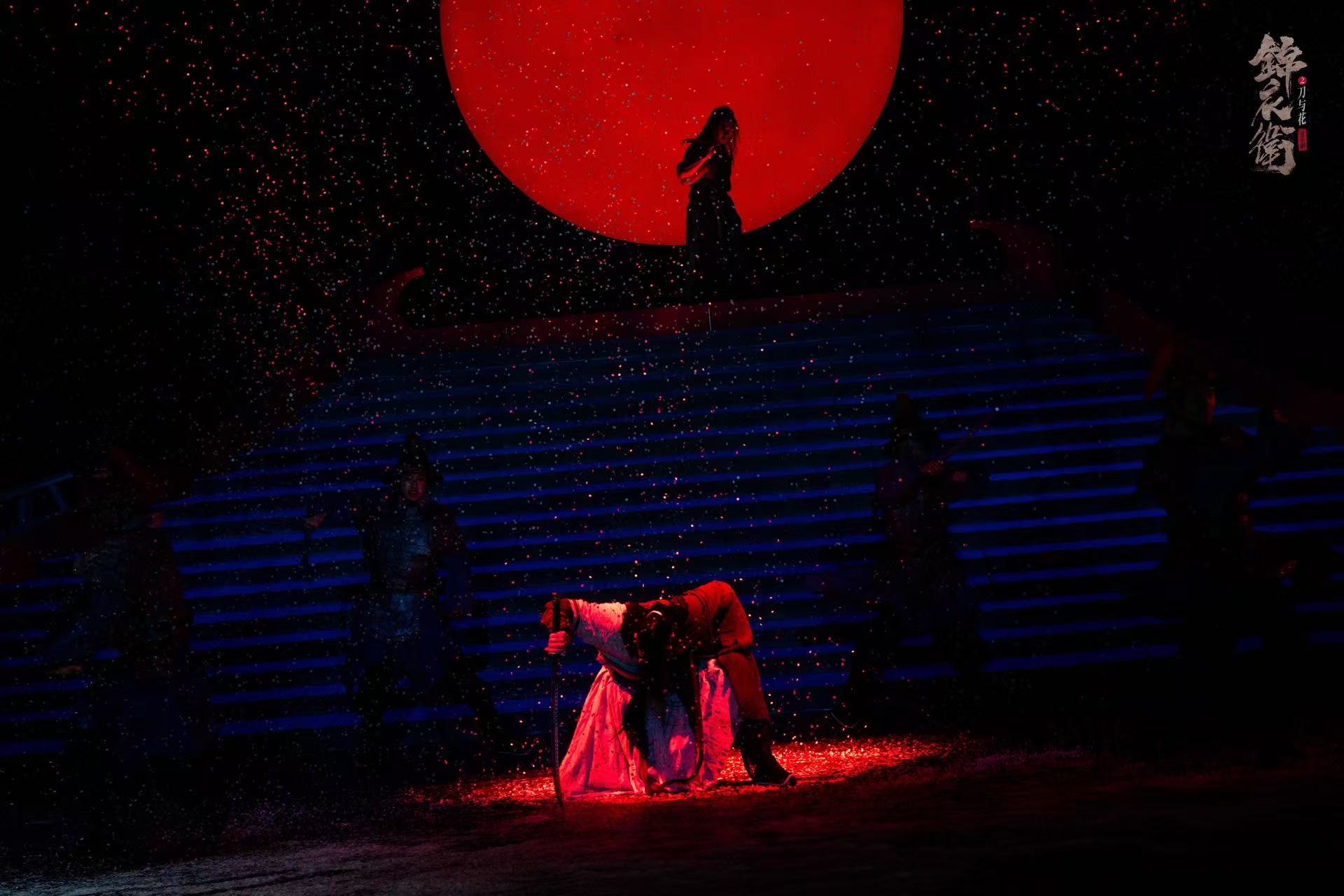 在舞美方面,《锦衣卫之刀与花》采用了“飞鱼服”与“绣春刀”这两个锦衣卫代表王权的身份标志作为隐喻,锦衣华服,威风凛凛,绣工精致,斩春如风。服化设计刘善通和赵欣表示,“飞鱼服”运用于戏剧舞台,遵循衣裳章法的同时,也根据角色形象、动作需求,进行了融合与艺术处理,突显舞动时的飘逸感、武打的力量感。绣春刀,既是角色手中的官刀依仗,也在舞美设计徐肖寰的巧思下融入舞台空间,成为一个重要的隐喻符号,展现了明代宣德年间的权力斗争、世代仇恨与家族命运的三重张力。飞鱼服、绣春刀的风光背后,是身为“鹰犬”的艰辛与无奈。舞台光影交错,将这一切历史与隐喻具象化,触动观众的情感深处。