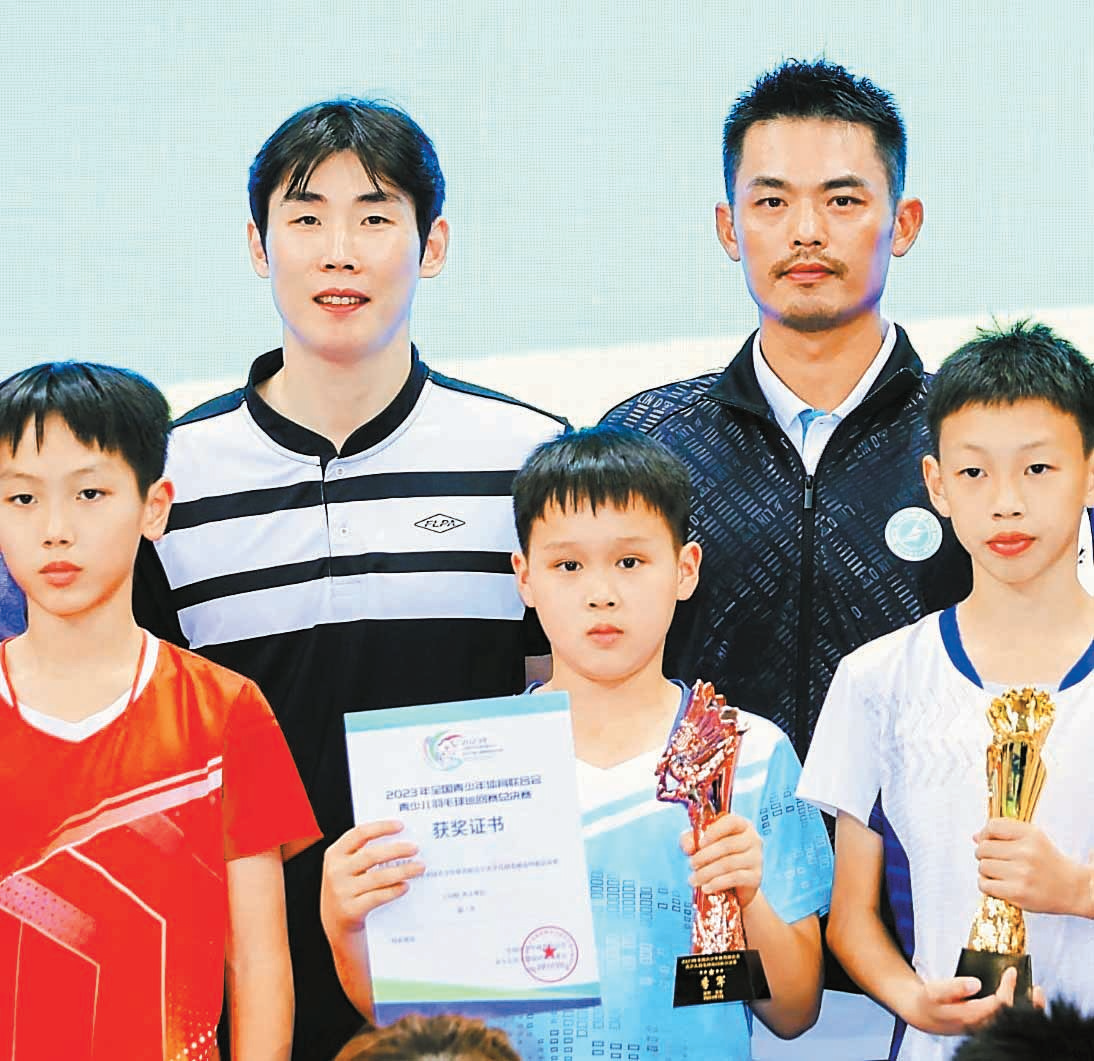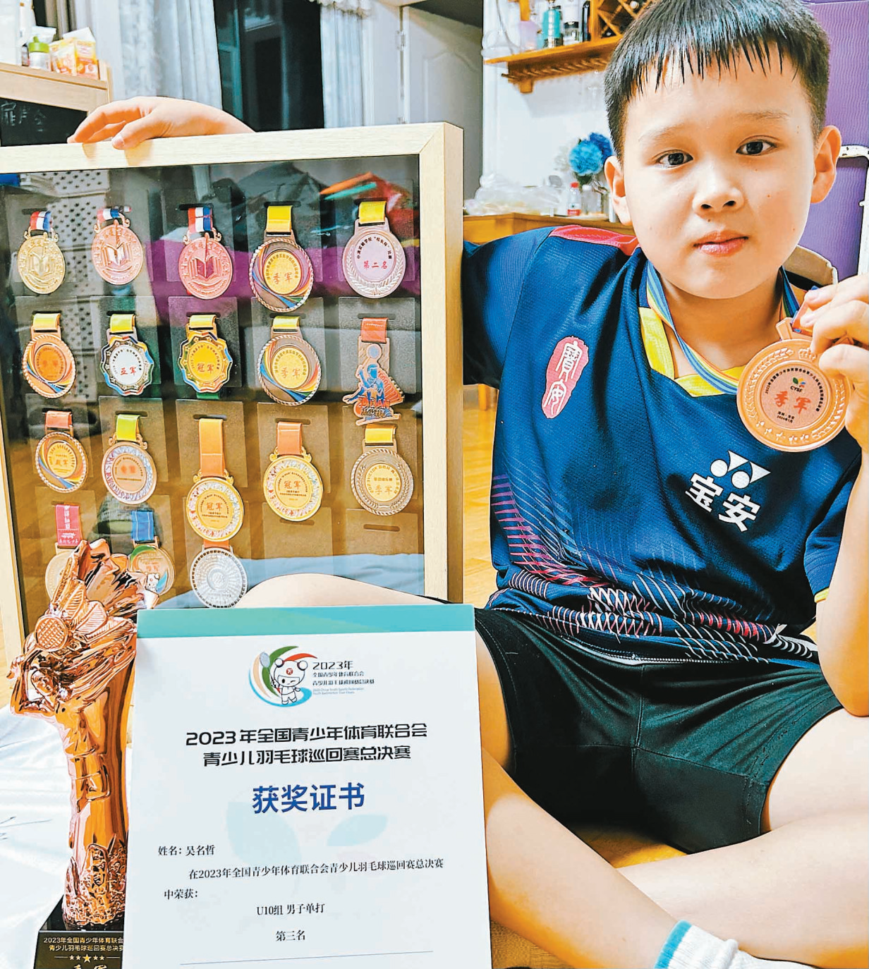 2022年起,吴名哲进入羽众羽毛球俱乐部特训,同年年底获得YONEX未来之志林丹杯赛男单U9第三名,获得与林丹合影的机会。2023年,他进步神速,不仅斩获市、区多项奖项,还在全国羽毛球后备人才基地比赛总决赛中获得10岁组男子双打第八名。“这一年,孩子开始自己规划时间,创造了‘午间20分钟作业法’,学业丝毫没落下。”吴先生说。