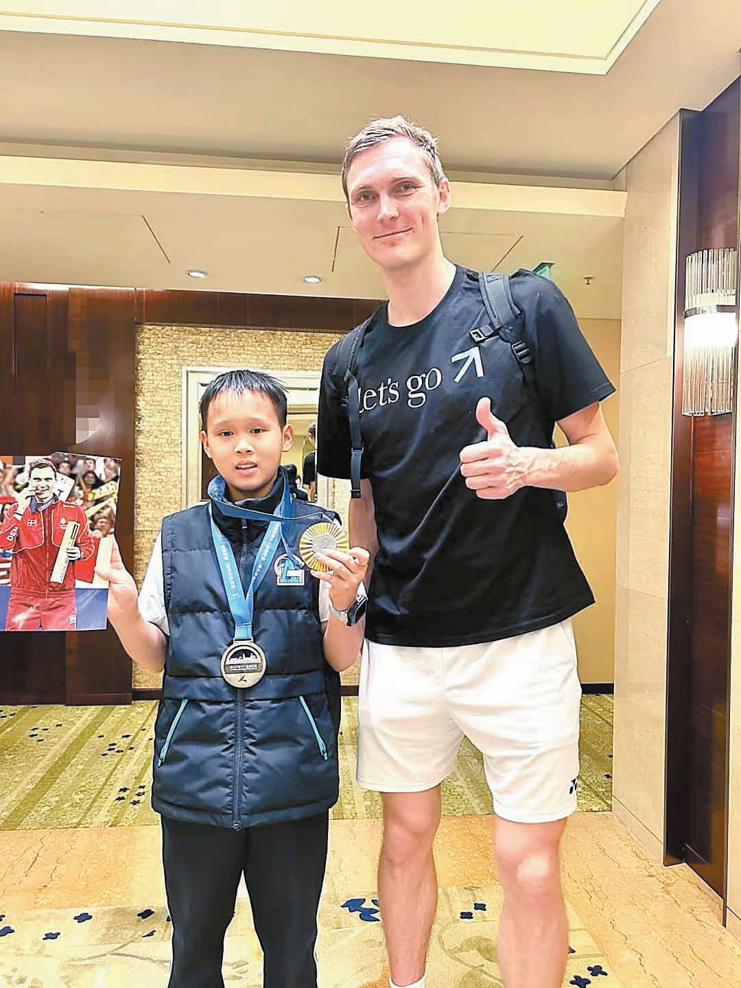 转机出现在2021中国银行“林丹杯”深圳宝安羽毛球公开赛的现场。那次赛事在宝安石岩街道举行,吴名哲的两个小伙伴是羽毛球迷,拉着他一同前往观赛。“到了赛场才知道,宝安的运动氛围有多浓。”吴先生说,看台上“全民健身,羽动宝安”的横幅格外醒目,赛场边陈列着奥运冠军林丹的战袍,观众席上此起彼伏的欢呼声让孩子们深受感染。更意外的是,吴名哲在现场转盘抽奖中抽中一等奖,不仅获得了林丹签名的球拍,还得到了与世界冠军谢杏芳合影的机会。