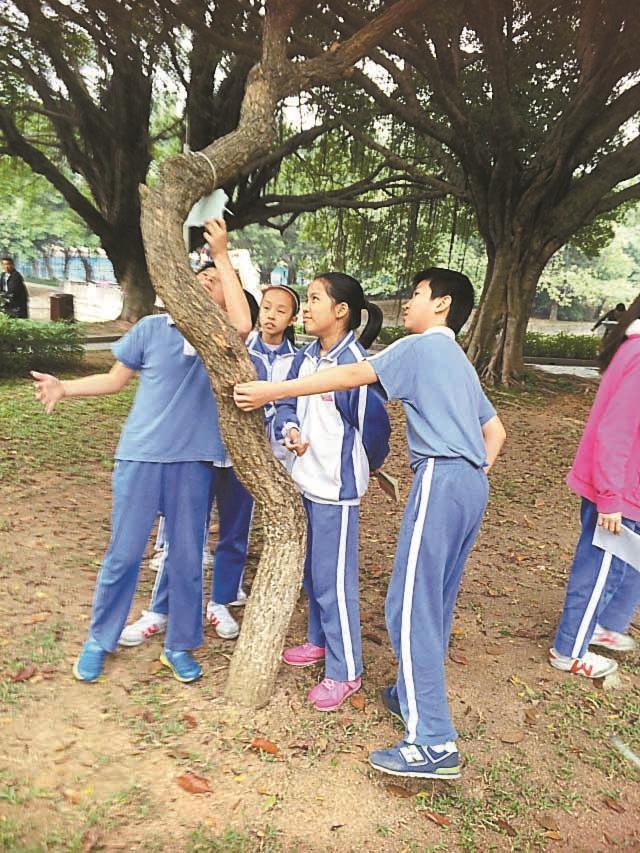 ▲学生们在新安公园观察树木,阅读树牌上的文字介绍。