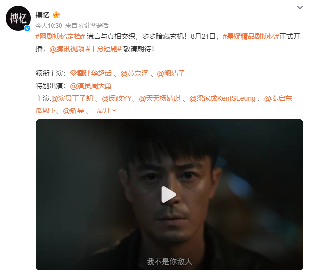 由彭发执导,霍建华、黄宗泽、阚清子主演的悬疑短剧《搏忆》,将于8月21日起播出。《搏忆》的设定为架空背景,以缉毒警察被杀害为主案件贯穿全剧。预计24集,每集19分钟。