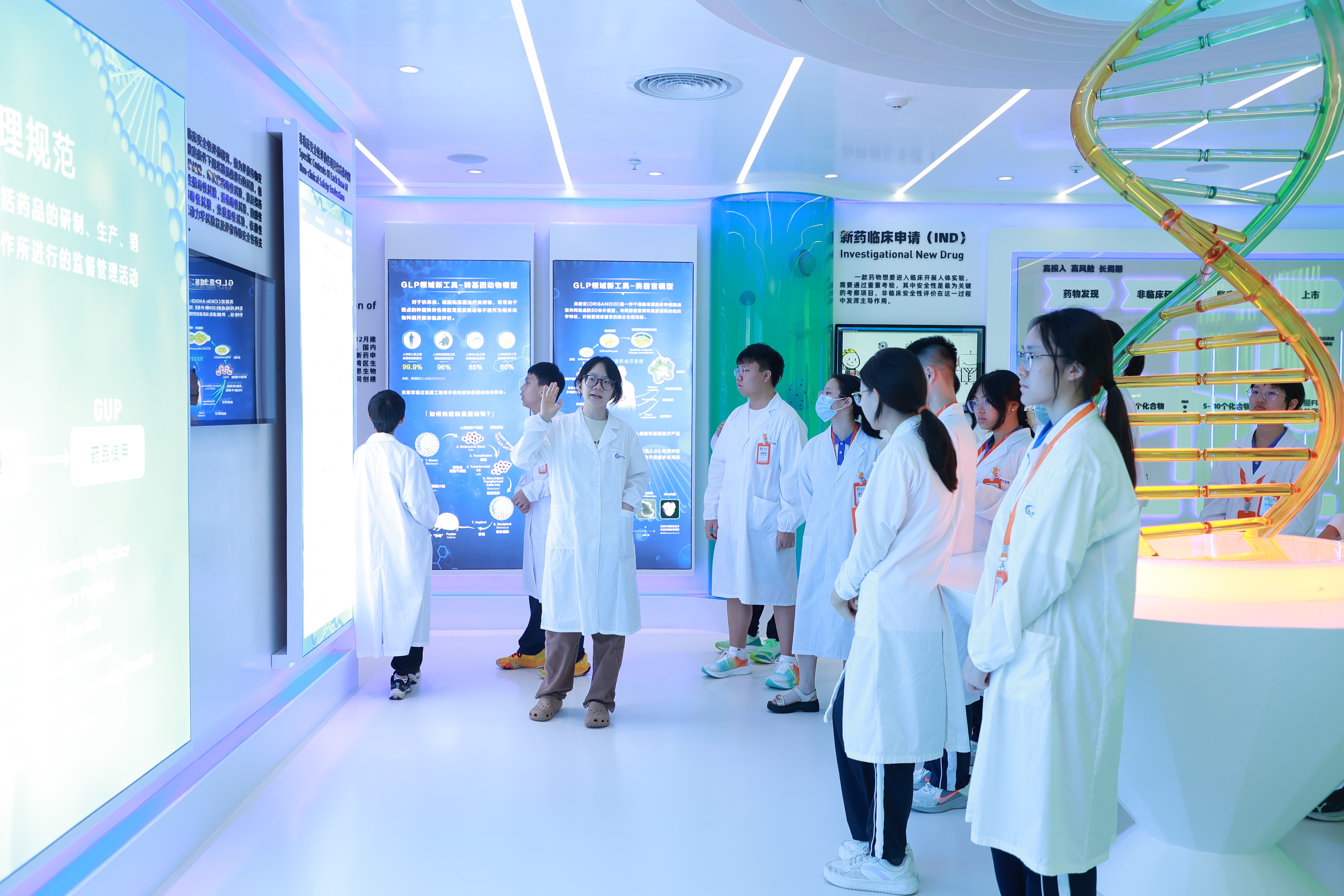 在分子生物学实验室、生物技术与药物创新科普馆的展馆参观学习中,青少年们近距离接触了高端科研仪器,了解了新药诞生的流程,尤其是处于创新前沿的细胞和基因治疗药物的研发过程。