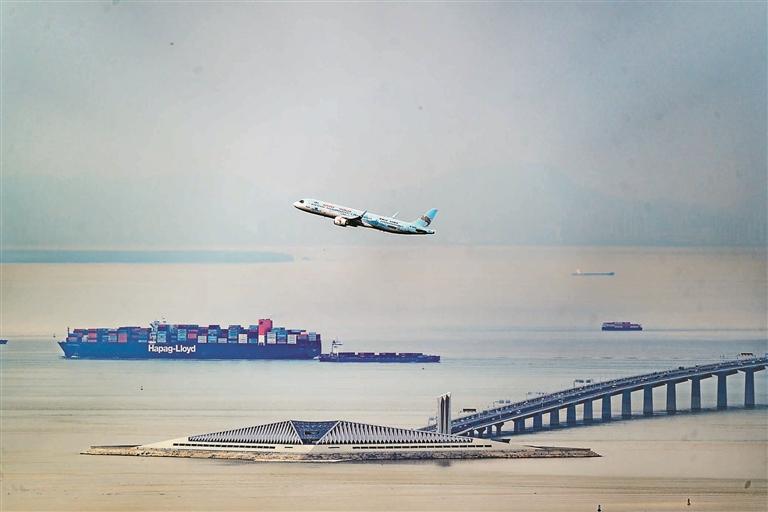 宝安的海岸线,繁忙的海陆空交相辉映。
