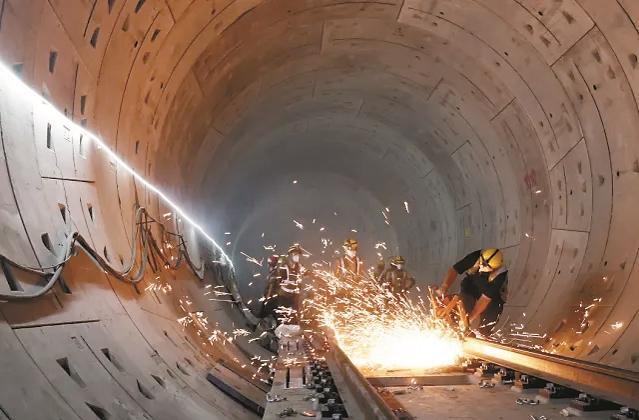 “长轨通”就是把一节节钢轨焊成一体,让地铁列车能平稳高速奔跑调试,这是地铁建设的关键节点。面临周边环境复杂、材料运输难、作业面狭窄等棘手问题,施工方港铁中铁电化公司运用“搭积木”式预制轨道板快速精调、智慧建造装备、数字化管理,创新采用了“倒铺法”(从中间向两端铺轨),在保障安全的前提下,提前高质量完成任务。
