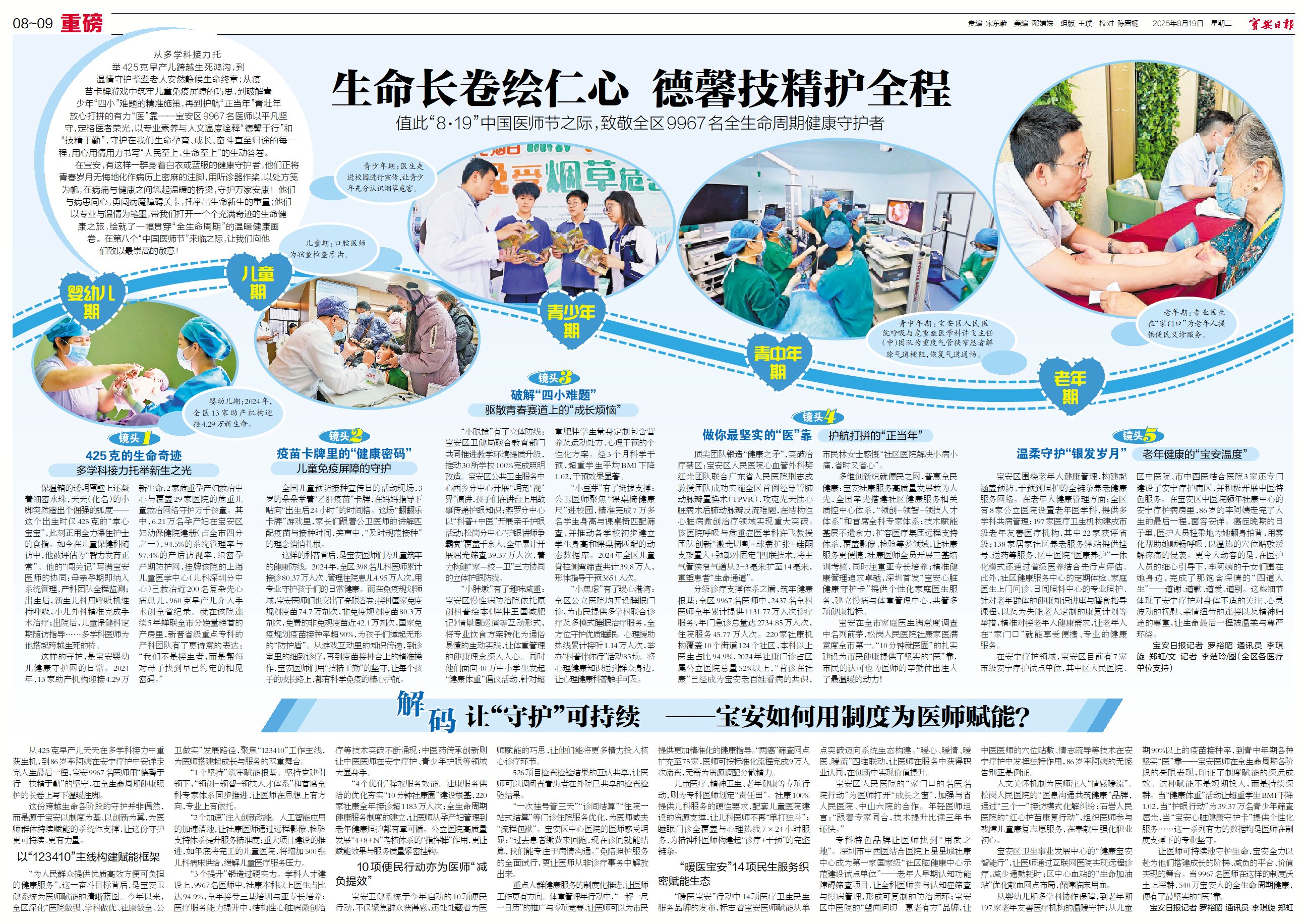 从多学科接力托举425克早产儿跨越生死鸿沟,到温情守护耄耋老人安然静候生命终章;从疫苗卡牌游戏中筑牢儿童免疫屏障的巧思,到破解青少年“四小”难题的精准施策,再到护航“正当年”青壮年放心打拼的有力“医”靠——宝安区9967名医师以平凡坚守,定格医者荣光,以专业素养与人文温度诠释“德馨于行”和“技精于勤”,守护在我们生命孕育、成长、奋斗直至归途的每一程,用心用情用力书写“人民至上、生命至上”的生动答卷。