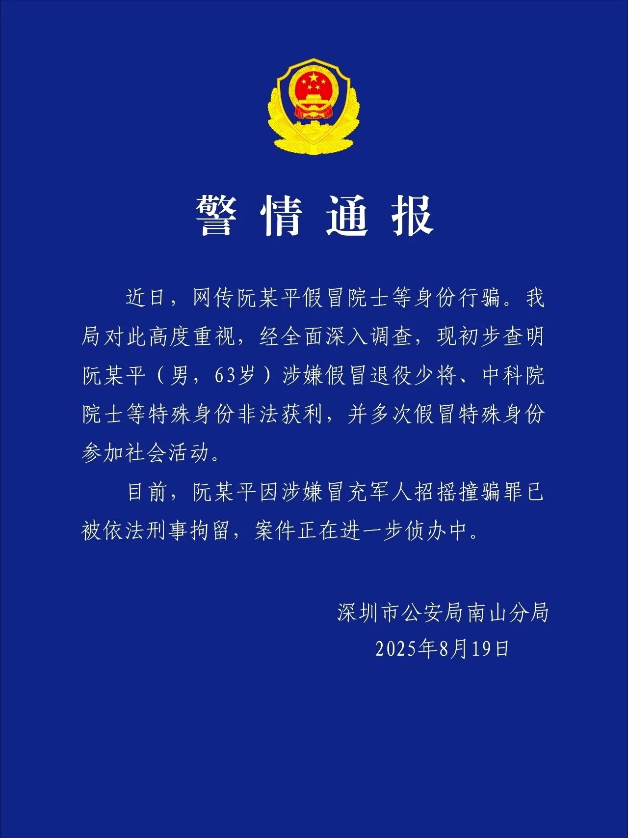 【深圳商报讯】(记者 罗凯燕 )8月19日,深圳市公安局南山分局就网传阮某平假冒院士等身份行骗事件发布警情通报。