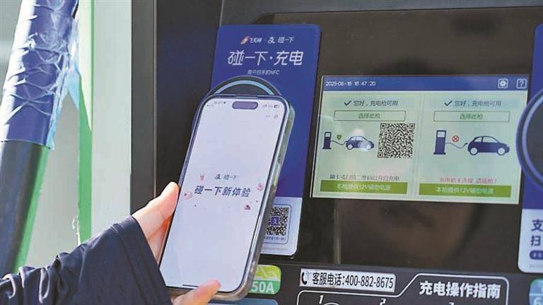 相较于传统的扫码充电流程,飞充网引入支付宝的“碰一下”交互模式将大幅简化用户充电操作。用户开启手机NFC功能,在完成插枪后,将手机对应感应区靠近充电桩的支付宝“碰一下”标识区域,即可瞬间唤醒充电确认界面,根据弹出提示,点击屏幕启动充电即可完成操作。