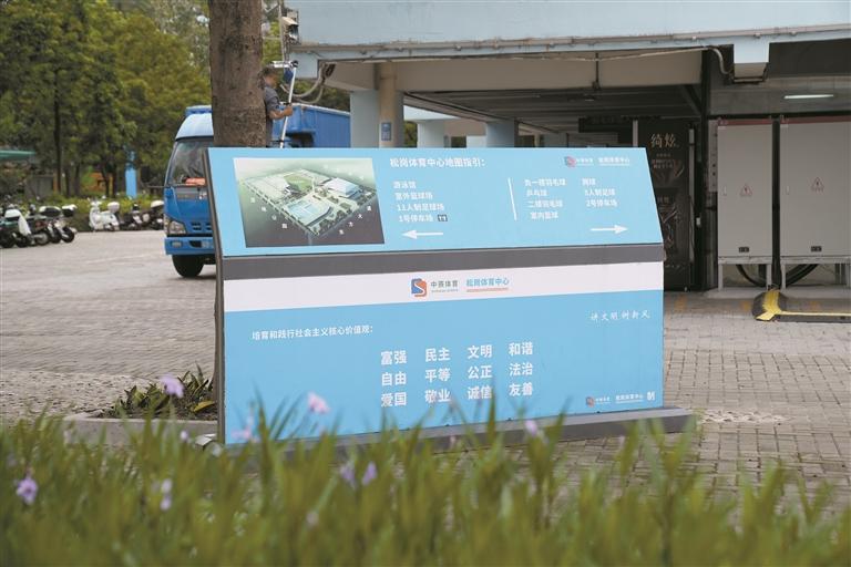 松岗体育中心绿荫环绕,文明标语随处可见。