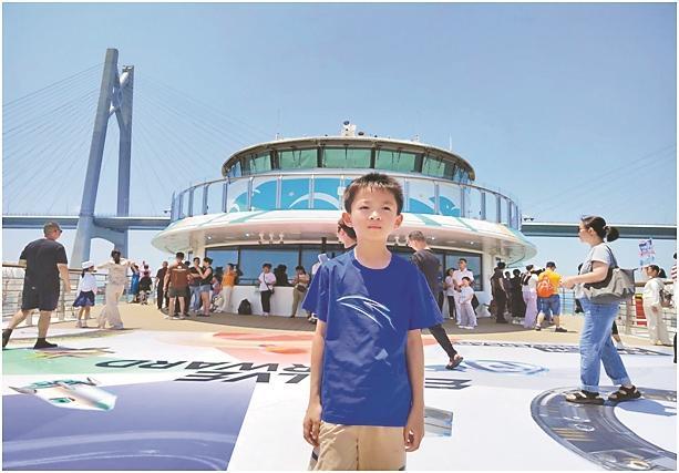 游轮慢慢驶近西人工岛,广播里说这座“海上城堡”是用120个巨型钢筒建造的。更不可思议的是前面就是海底隧道,由33节沉管组成,每节都重达8万吨!想到汽车正在我们脚下40米深的海底行驶,我惊讶得张大了嘴巴,真是太不可思议了!当《灯火里的中国》旋律响起时,全船人都挥舞着五星红旗放声歌唱。我举着国旗,看着雄伟的中国结桥塔、穿梭的货轮、起降的飞机,还有远处若隐若现的香港,太震撼了,这就是我们的大湾区,这就是让世界惊叹的中国超级工程!