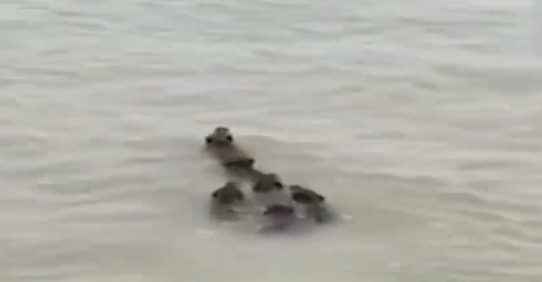 视频中显示,六头野猪整整齐齐、不慌不忙地在江水中前进。该网友称,10多分钟后六头野猪最终成功游到对岸。