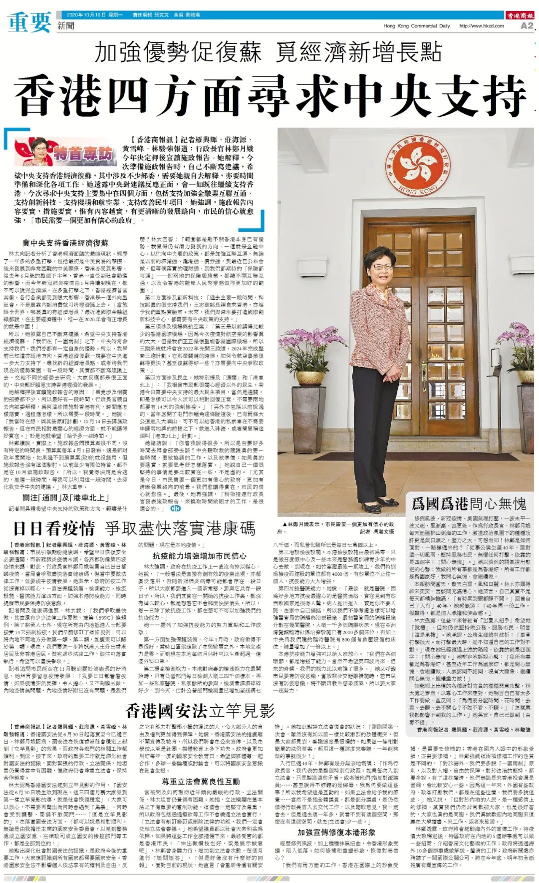 林郑续说,实际上,施政报告同预算案很不同,没有特定的时间表。预算案每年4月1日发布,这是新财政年度开始,如果过不到预算案(政府)就没钱用,但施政报告没有这个掣肘。以前至少有两位特首,都不是在10月做施政报告。“所以,我觉得决定是合适的,推迟一段时间,等我可以利用这一段时间,去深化我交予中央的建议。”林太重申。