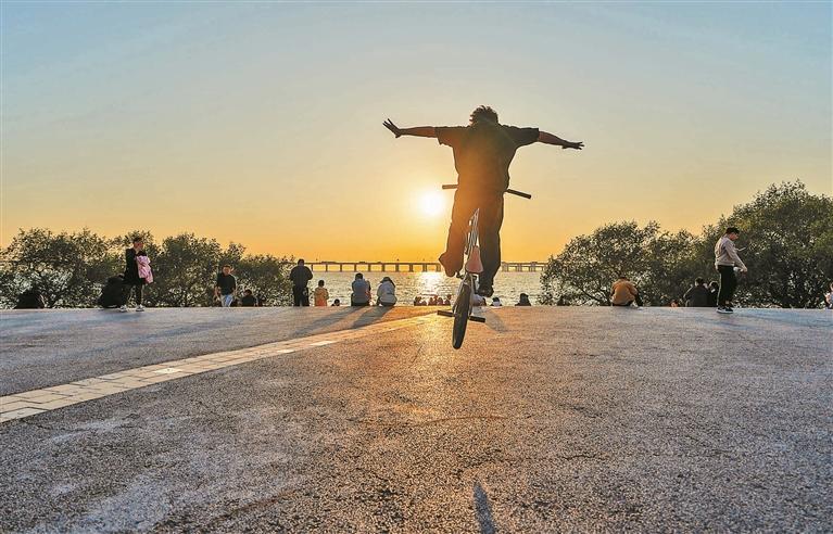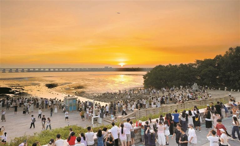 ▲西湾红树林公园的日落时常吸引市民前来观赏。