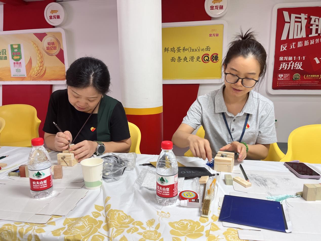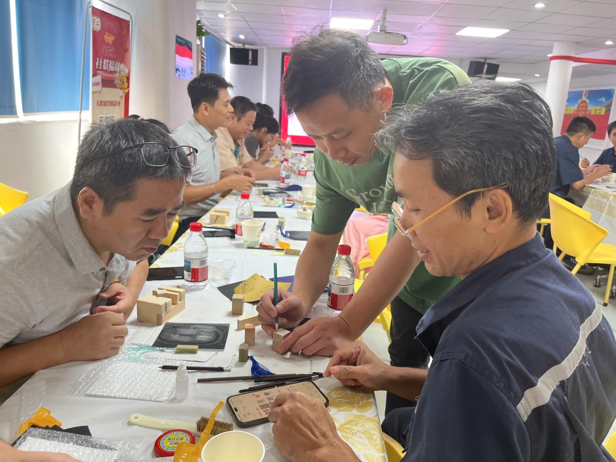 在“方寸见初心”篆刻工坊中,党员们以刀为笔、以石为纸,将赤湾左炮台、改革开放标志性符号等红色元素精心镌刻于方寸印章之上。活动现场金石声脆,党员们凝神屏息,在非遗传承人的指导下,一笔一划勾勒历史脉络,一凿一刻铭记初心使命。一枚枚印章成为可触摸的红色记忆载体,既再现了传统篆刻技艺的精髓,更让党的历史在艺术创作中鲜活起来,实现了“党建+非遗”从形式到内涵的创新突破。