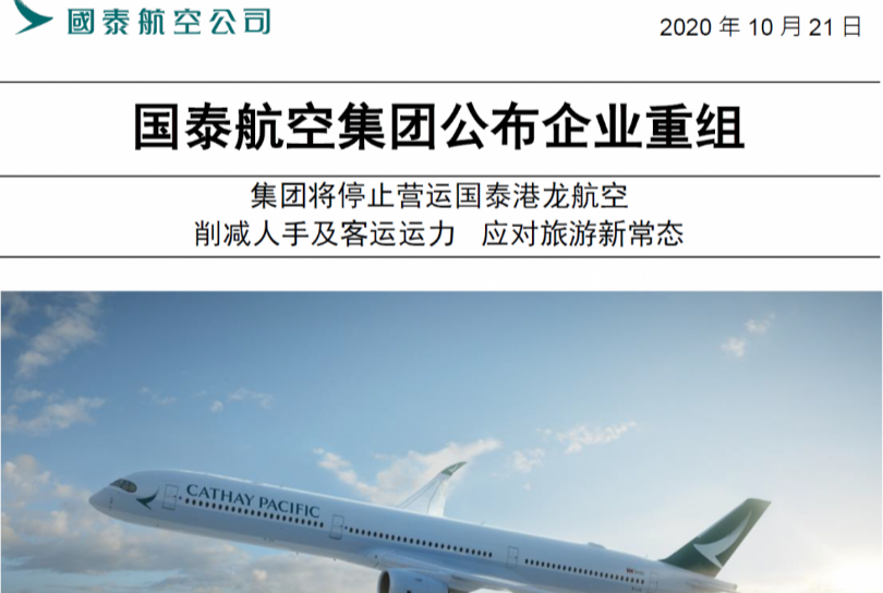 国泰航空行政总裁邓健荣表示:「疫情席卷全球,持续为航空业带来沉重打击。我们必须进行根本性的重组,否则集团最终将无法继续营运下去。只有这样,才能尽力量保留最多的工作岗位,同时履行对香港航空枢纽和顾客的责任。」