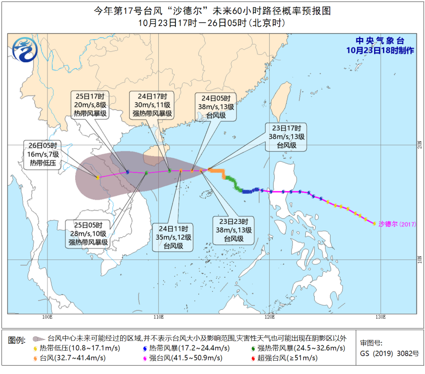 23日18时今年第17号台风“沙德尔”(台风级)中心位于位于南海中部海面,中心附近最大风力13级(38米/秒),继续向偏西方向移动,24日傍晚到夜间趋向越南中北部沿海。