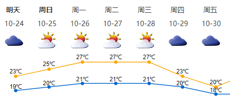 23日夜间至24日阴天间多云,偶有小雨,最大阵风8级左右,气温略降,早晚清凉,19-23℃;