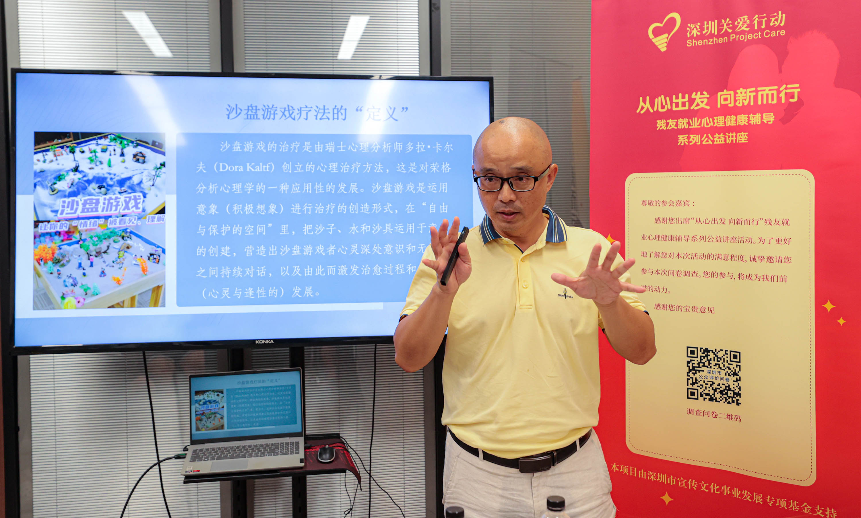 8月27日下午,由深圳市关爱办主办、握手世界就业服务(深圳)有限公司承办的第三期“从心出发 向新而行”残友心理健康辅导系列公益讲座在握手世界就业服务中心开讲。本次讲座聚焦残友职场心理调适需求,邀请行业资深人士分享实战经验,并创新引入沙盘游戏心理疗愈环节,为残友群体送上“心灵关怀大礼包”。
