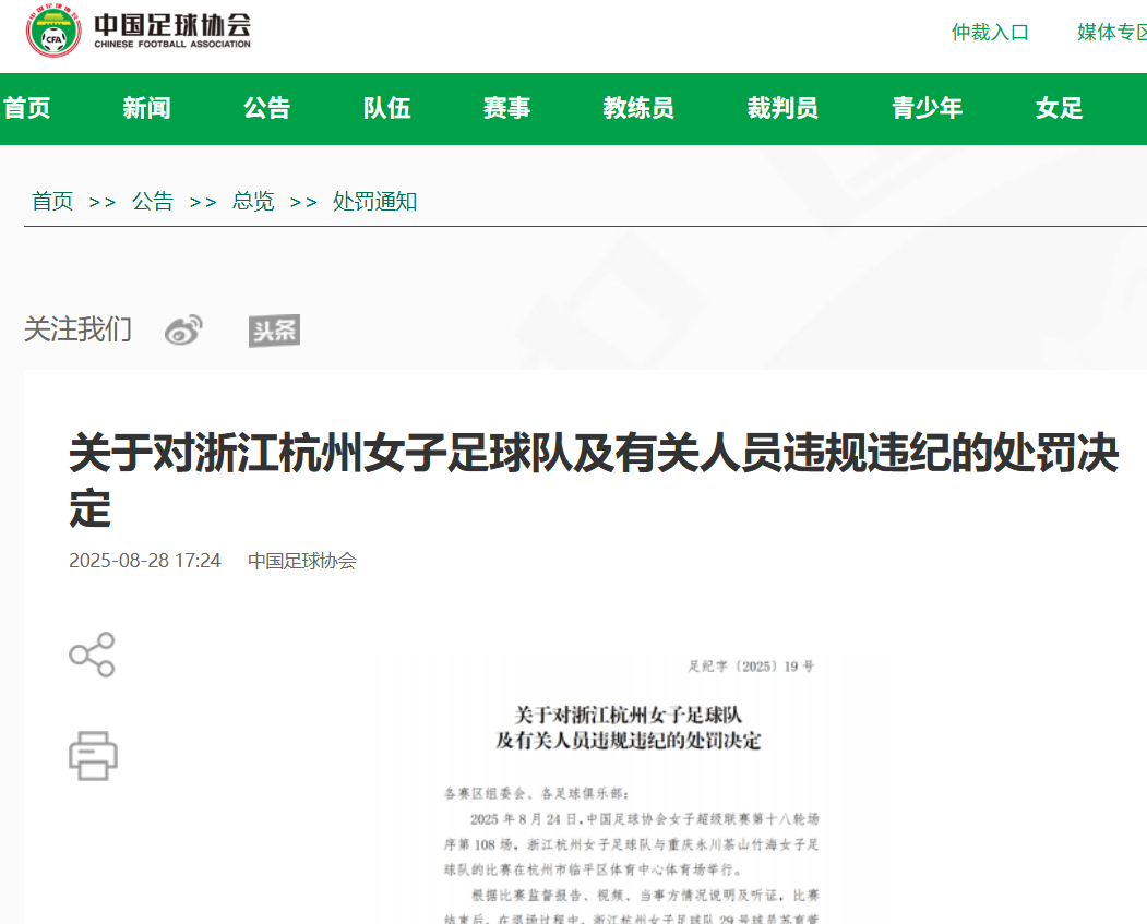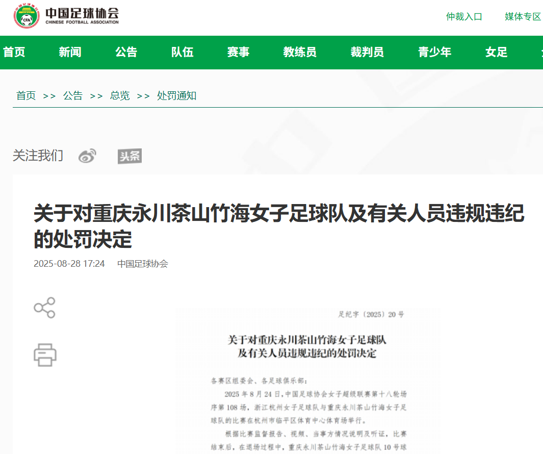 8月28日下午,中国足协在官网针对8月24日晚杭州银行女足主场与永川茶山竹海女足赛后冲突开出重磅罚单。