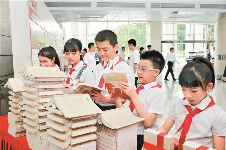 ▲龙华区外国语教育集团的学生代表获赠《红色白石龙》书籍。