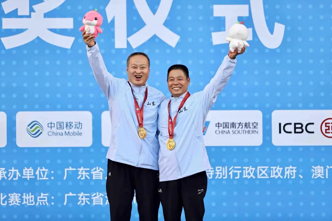 男双“巅峰对决”在山东队与黑龙江队之间展开,双方势均力敌,比分紧咬至最后一刻。最后时刻,山东队进球得分,以19:18惊险取胜。教练兼运动员赵光军眼含泪花,他说,这是全国水平最高、竞争最激烈的赛事,会聚了各地最顶尖的选手,虽然开局不利,也是第一次搭档,“但我们没有放弃,而是一路坚持、一路拼搏。”