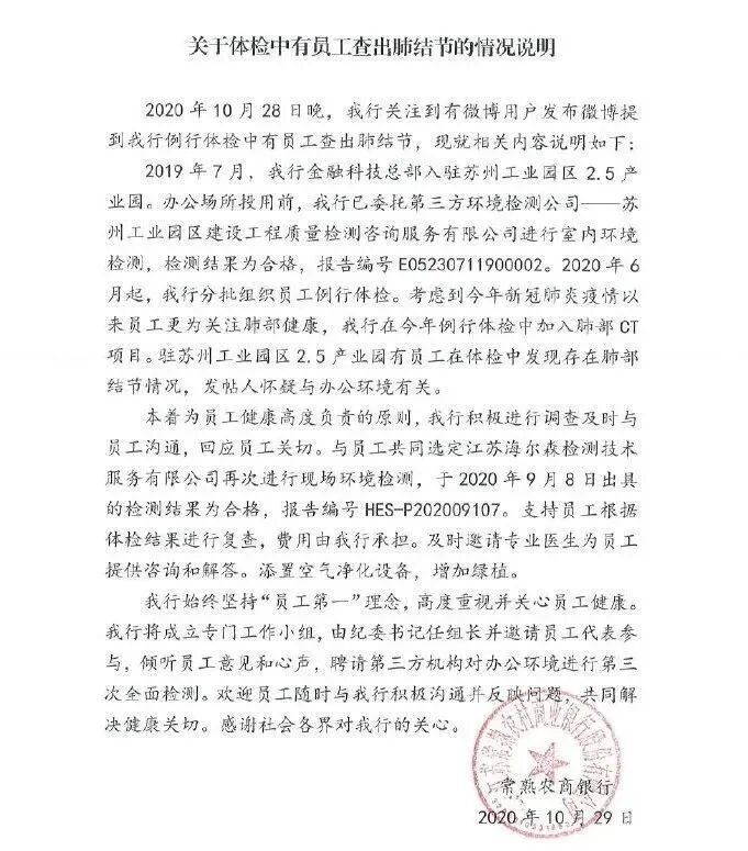 10月29日,常熟农商银行在其官网回应称:2019年7月,其金融科技总部入驻苏州工业园区2.5产业园。在办公室投入使用前,就曾委托第三方进行室内环境检测,检测结果为合格。
