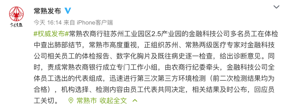 10月31日,江苏省常熟市委外宣办、常熟市政府新闻办官方微博发布消息称,常熟农商行驻苏州工业园区2.5产业园的金融科技公司多名员工在体检中查出肺部结节,常熟市正组织苏州、常熟两级医疗专家对金融科技公司相关员工的体检报告、数字化胸片及既往病史逐一检查,给出诊断意见。