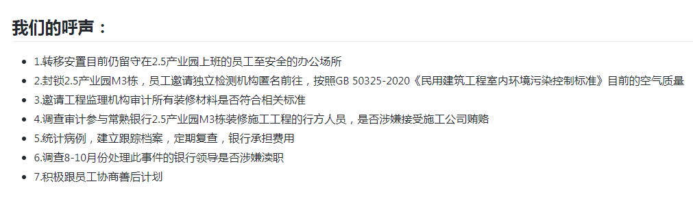 同时,针对29日常熟农商行对外公布的“关于体检中有员工查出肺结节的情况说明”,申诉材料中还对办公场所室内环境检测结果、员工体检项目以及添置空气净化设备等方面提出质疑。