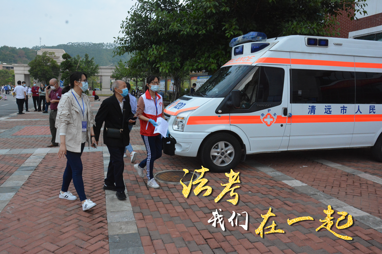 清远市司法局考务工作人员和志愿者协助高龄考生上考场。