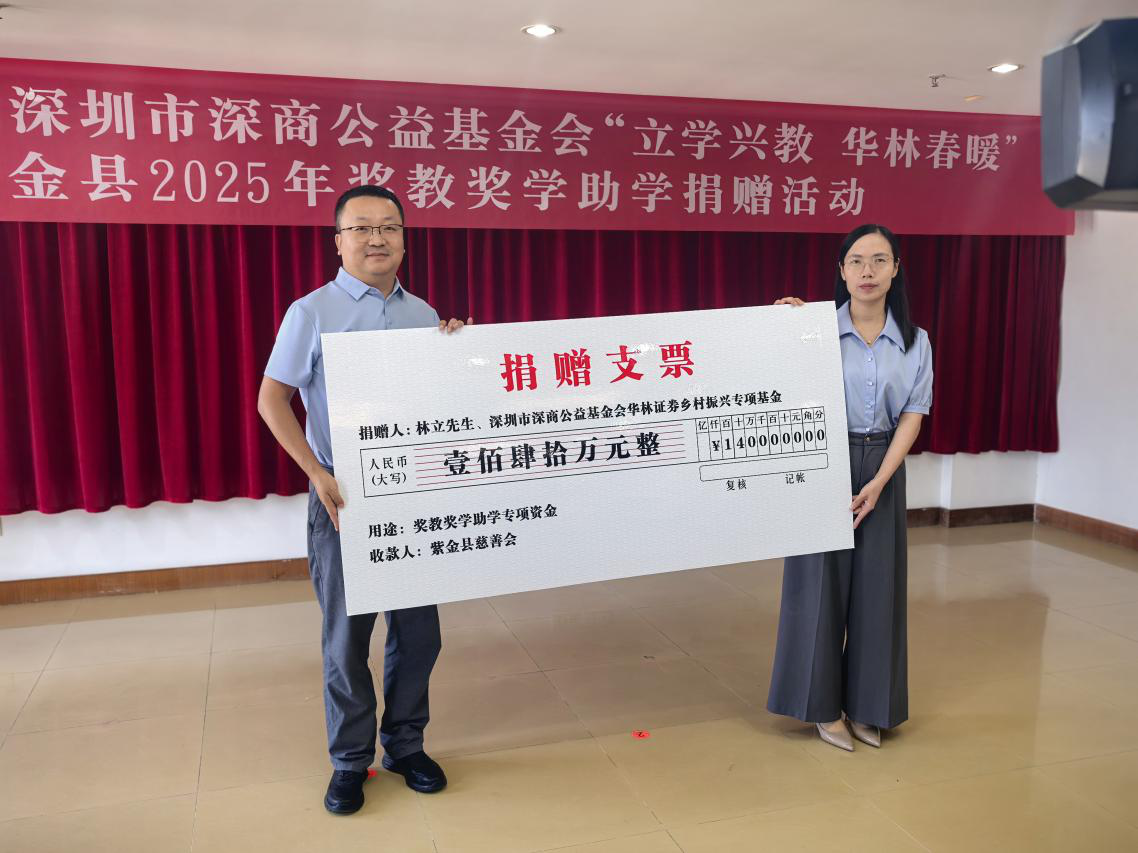 近日, 深圳市深商公益基金会 "立学兴教 华林春暖" 紫金县 2025 年助学奖教捐赠活动在紫金县举行。此次捐赠由华林证券董事长林立与深商公益基金会联合发起,通过华林乡村振兴专项基金全额筹措。