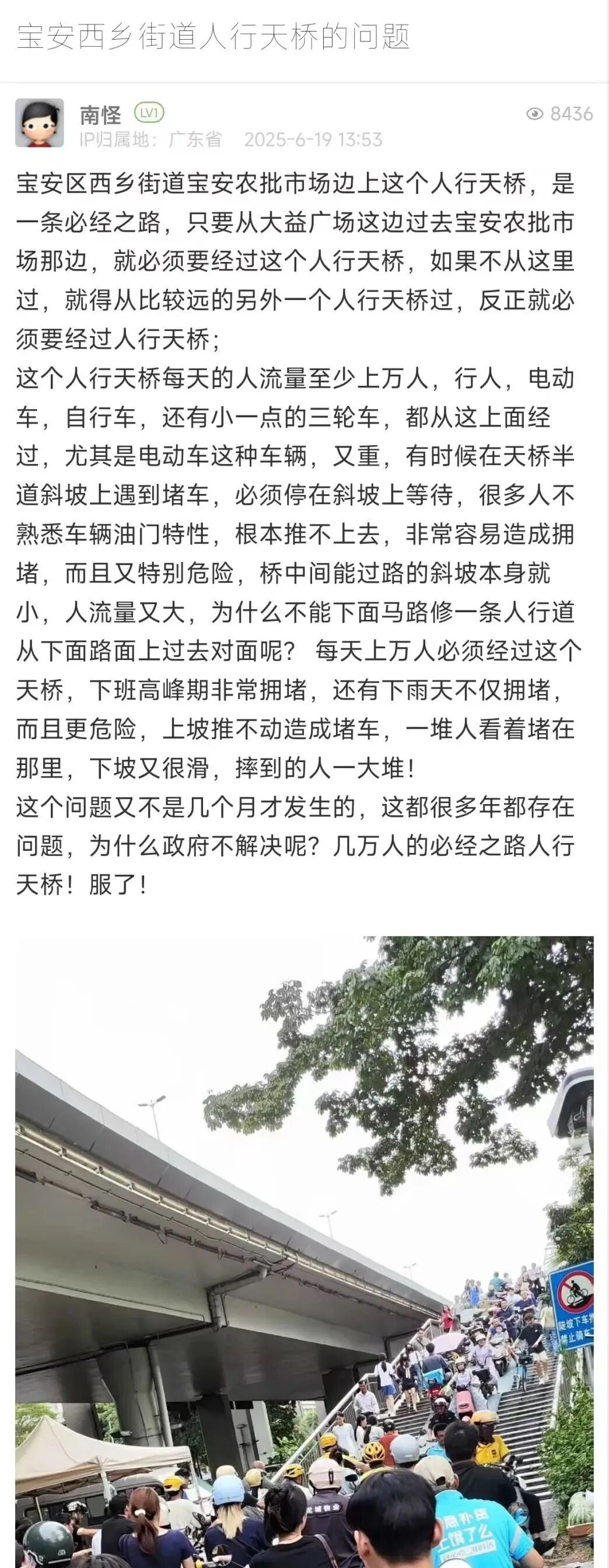 “宝安区西乡街道宝安农批市场边上这个人行天桥,是一条行人必经之路,每天人流量至少上万人,上坡推不动、下坡又很滑,摔倒的人一大堆……”今年6月,有网友在深圳新闻网深圳论坛发帖,反映宝安一人行天桥高峰期存在拥堵等问题。