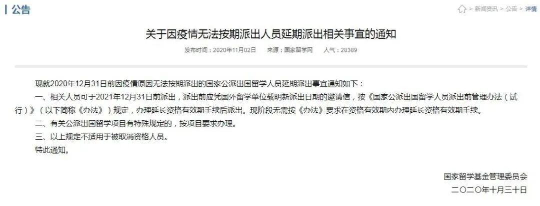 国家留学基金委近日发布通知,2020年12月31日前,因疫情无法按期派出的国家公派出国留学人员可于明年12月31日前派出,派出前应凭国外留学单位载明新派出日期的邀请信,按规定,办理延长资格有效期手续后派出。