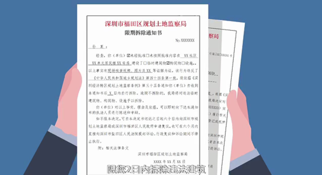 11月5日,福田区规划土地监察局推出系列动画视频《违建不可为,害人终害己》,该系列视频立足目前常见违建状态,讲述3位主人公的违建故事,通过案例解析、风险预警、处罚警示等方法,加深辖区居民对于违建危害的认知,呼吁市民:“莫因一时心动,换取一生悔过!”