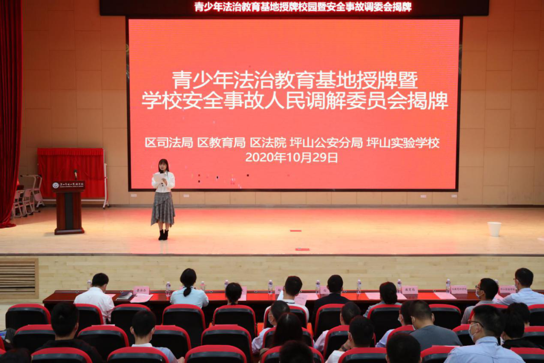 今年4月10日,广东省教育厅、广东省司法厅、广东省普法办公室公布了第二批32个全省青少年法治教育基地,其中坪山实验学校青少年法治教育基地成功入选。近日,坪山实验学校举办 “省级法治教育基地”授牌仪式,该校“学校安全事故人民调解委员会”同时揭牌。