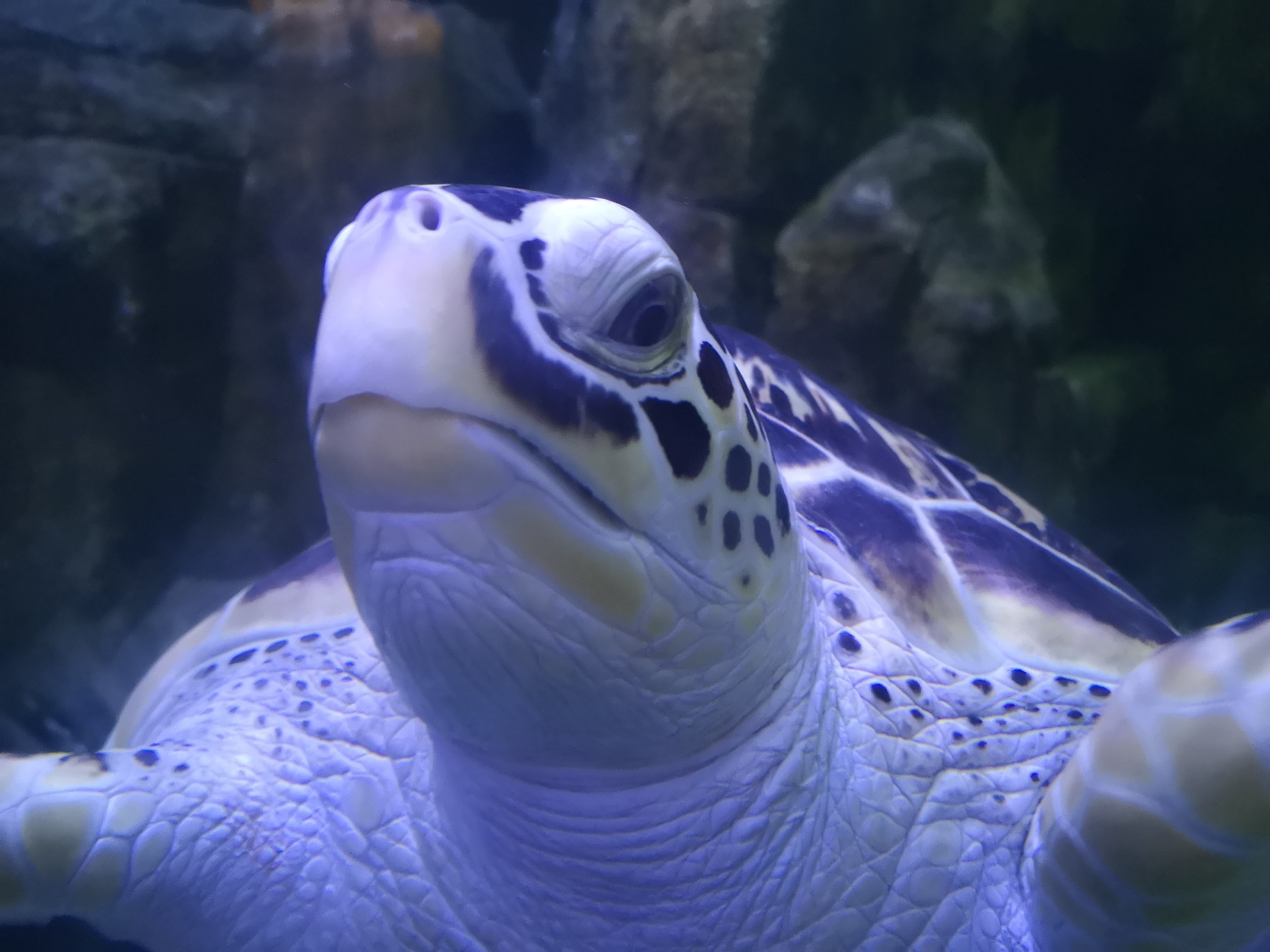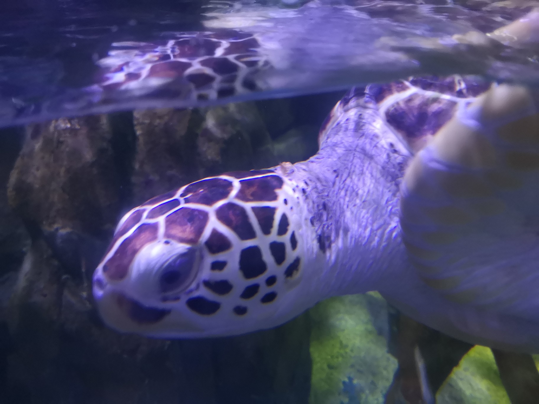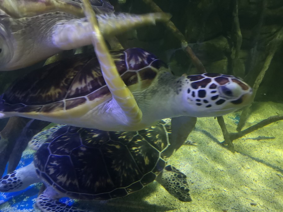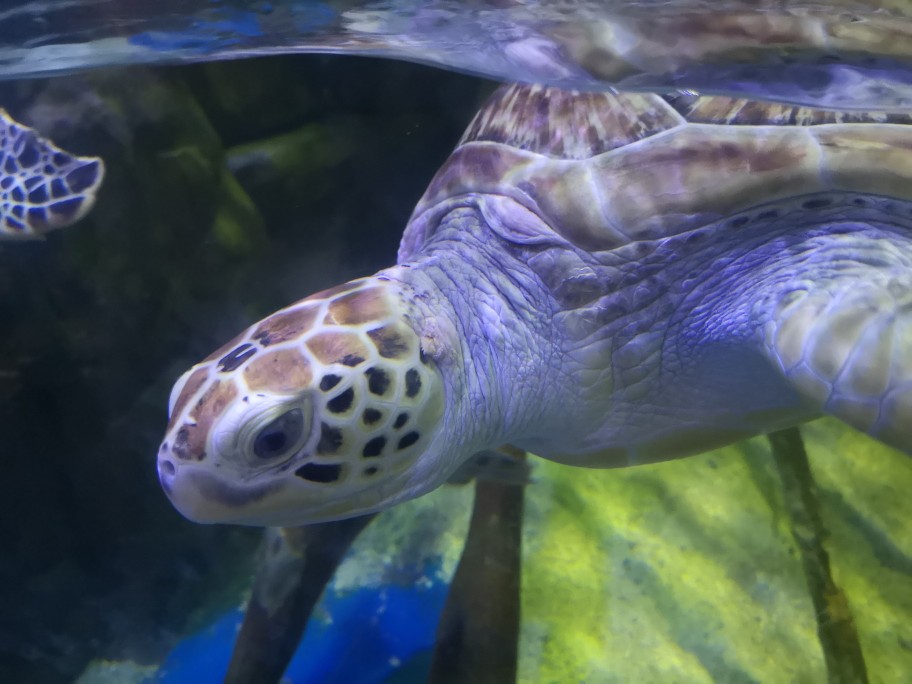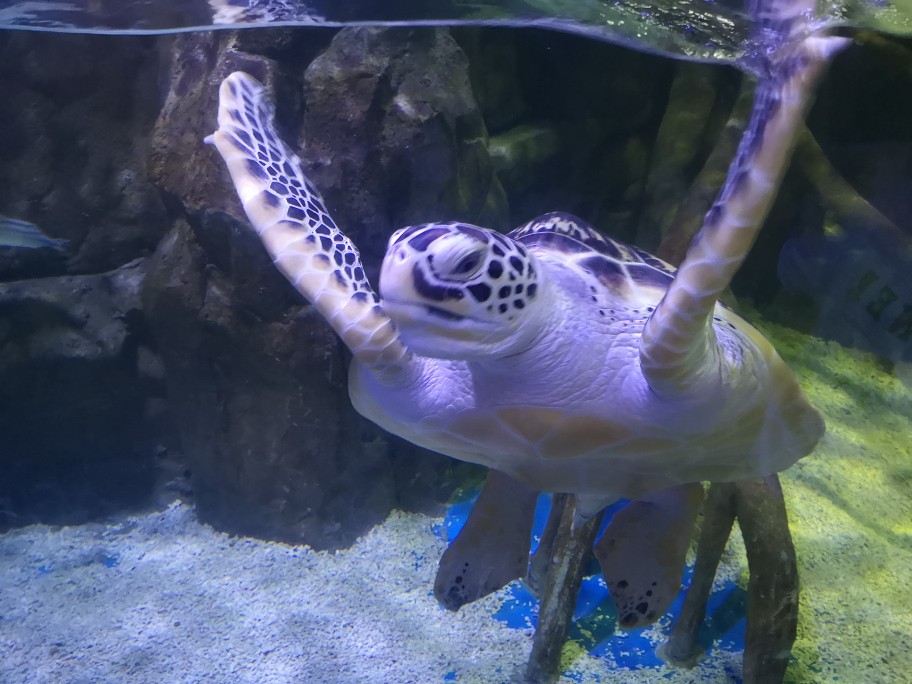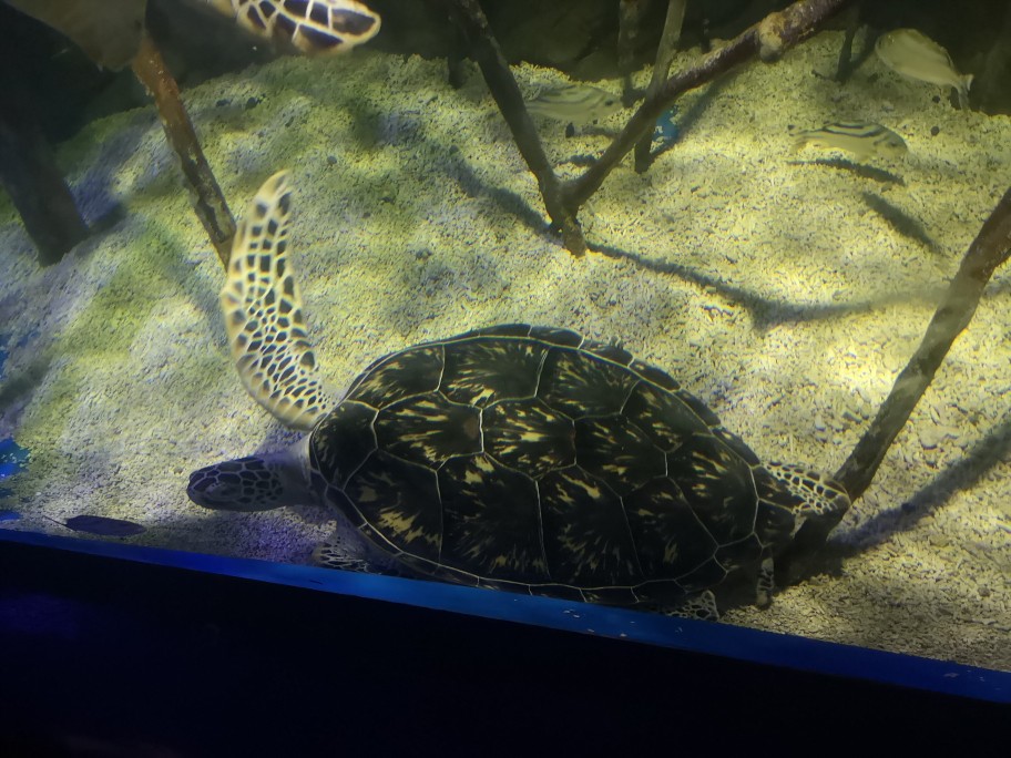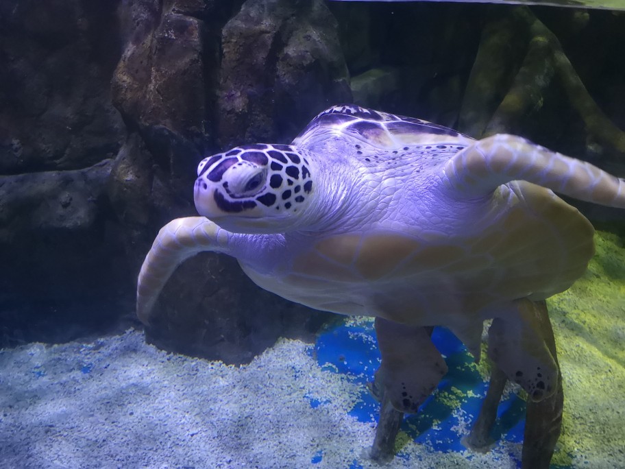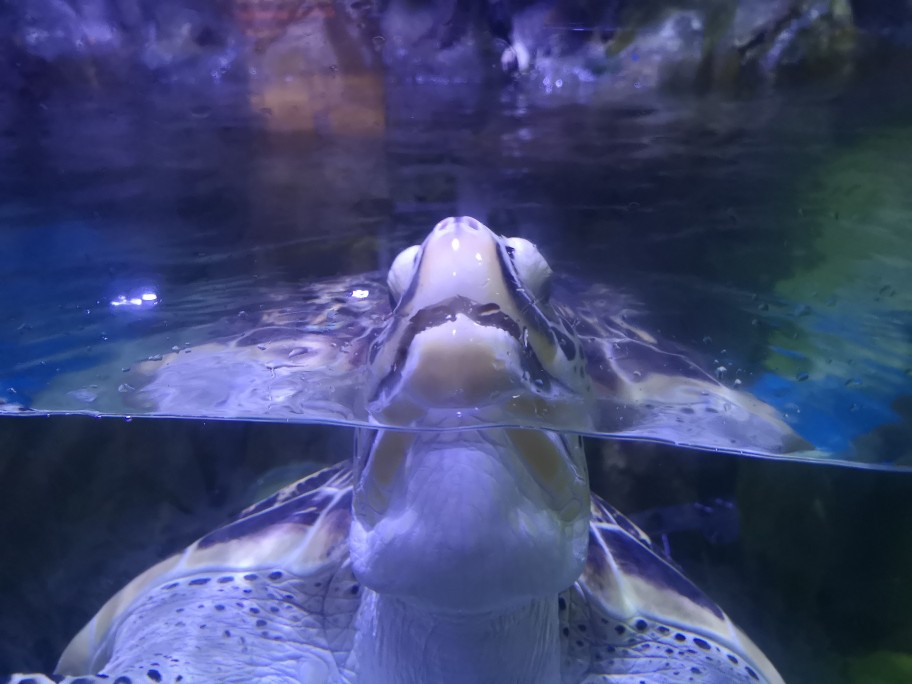 【世界海龟日5.23】学名:绿海龟,又称绿蠵龟、青海龟 时间:去年夏天 地点:欢乐海岸海洋世界 观察记录:龟甲扁圆,头和四肢露在壳外,无法将头完全缩进壳内。腹部扁平,茶褐色或暗绿色(因为经常吃海藻)。四肢像船桨,背部覆盖满大鳞片,前肢长于后肢。头部呈三角形,嘴巴圆润,上颚前端微勾,眼睛大且眼珠黑。 海龟肯定不是急性子,脾气好好,性格温和,慢吞吞的,在水里划来划去悠然自得。刚好前几天是世界海龟日,海龟还是国家二级保护动物噢,我们要好好保护他们,保护海洋动物,保护大自然~🙏#奇妙海洋生物# 私心安利一波,大家有机会可以去珠海长隆海洋世界,那里的鲸鲨海洋馆真的让人叹为观止,会让你感受到海洋的包罗万象以及人类的渺小(这不是广告555)。