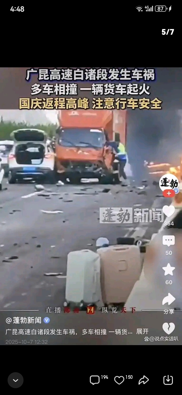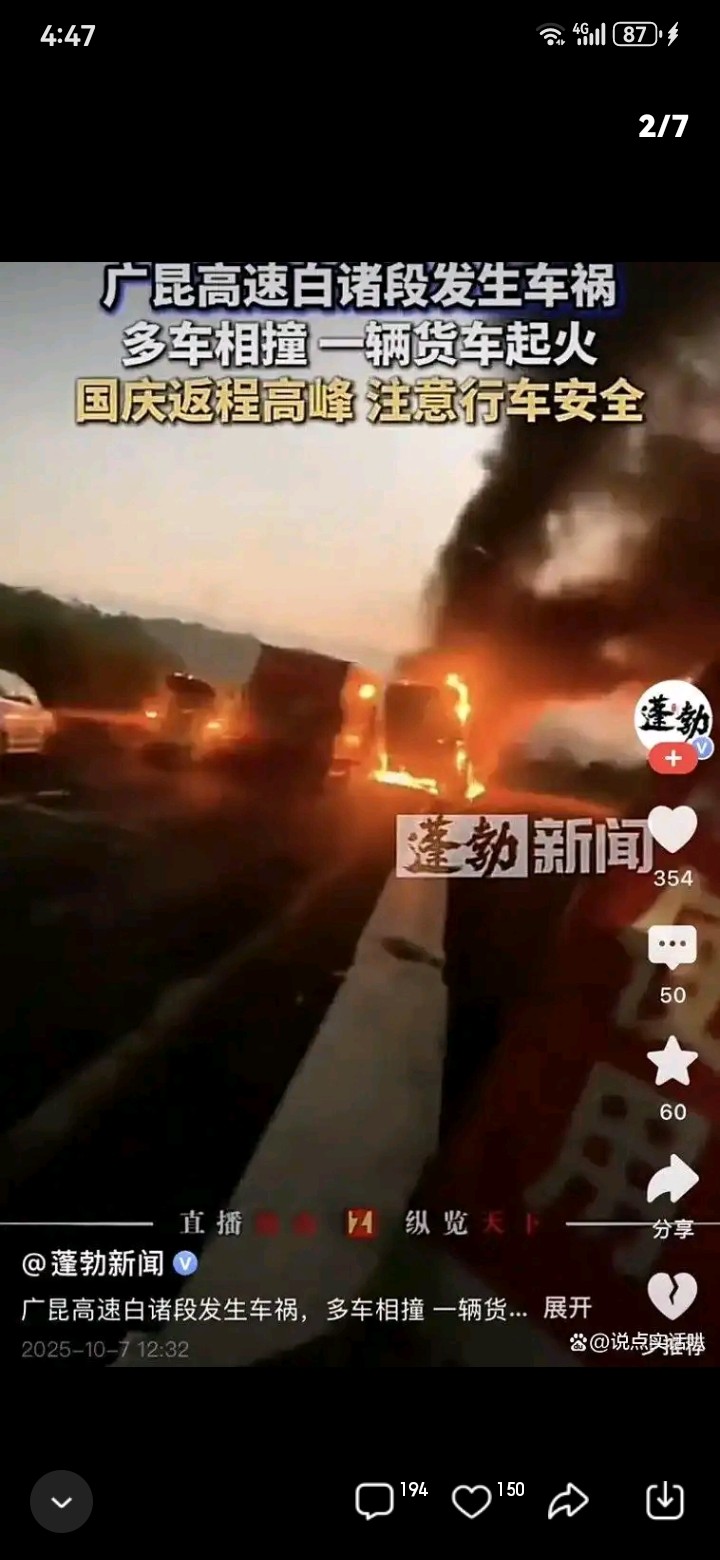 事情发生在10月7日凌晨,正是国庆返程的高峰时段。地点在G80广昆高速,肇庆往广州那个方向,具体就是靠近肇庆的路段。当时有个司机正开着车呢,突然前面就堵住了。他掏出手机看导航,屏幕上赫然显示:"前方事故,事故在右侧车道",预计通过这2.1公里的拥堵路段得24分钟。要知道平时这点路,也就一两分钟的事儿。等车慢慢往前挪,这位司机才看清前面的状况——我的天,一辆货车正烧得火光冲天,浓烟滚滚的,老远就能看见那火苗子往上窜。周围散落着车辆碎片,好几辆车横七竖八地停着,场面那叫一个惨烈。有媒体发布的视频显示,着火的货车已经被大火完全吞没了,根本看不清原来是啥样。火场周围全是碎片,后面还有一堆车被堵着动弹不得。视频上打着字:"广昆高速百诸段发生车祸 多车相撞一辆货车起火 国庆返程高峰 注意行车安全"。发布时间显示是2025年10月7日12:32。
