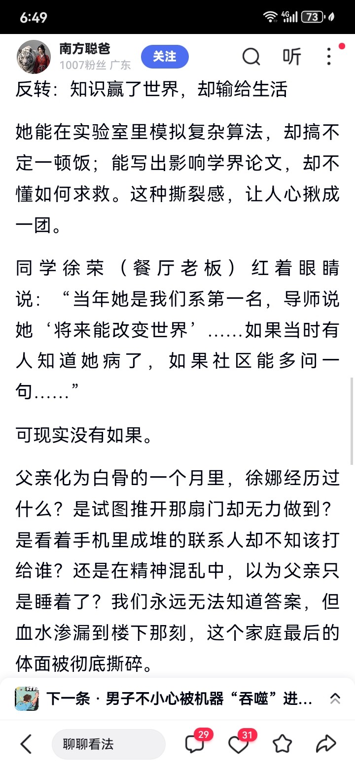 [惊恐]太痛心~太可惜了[惊恐]最扎心的细节来了:身体硬朗的父亲负责采买日常用品,而徐娜连独自出门都成问题。邻居说:“每次见她出门,都是父亲紧紧牵着她的手。”所以当父亲突然离世,那个曾解得出宇宙级难题的剑桥博士,竟可能因不会照顾自己而活活饿死。