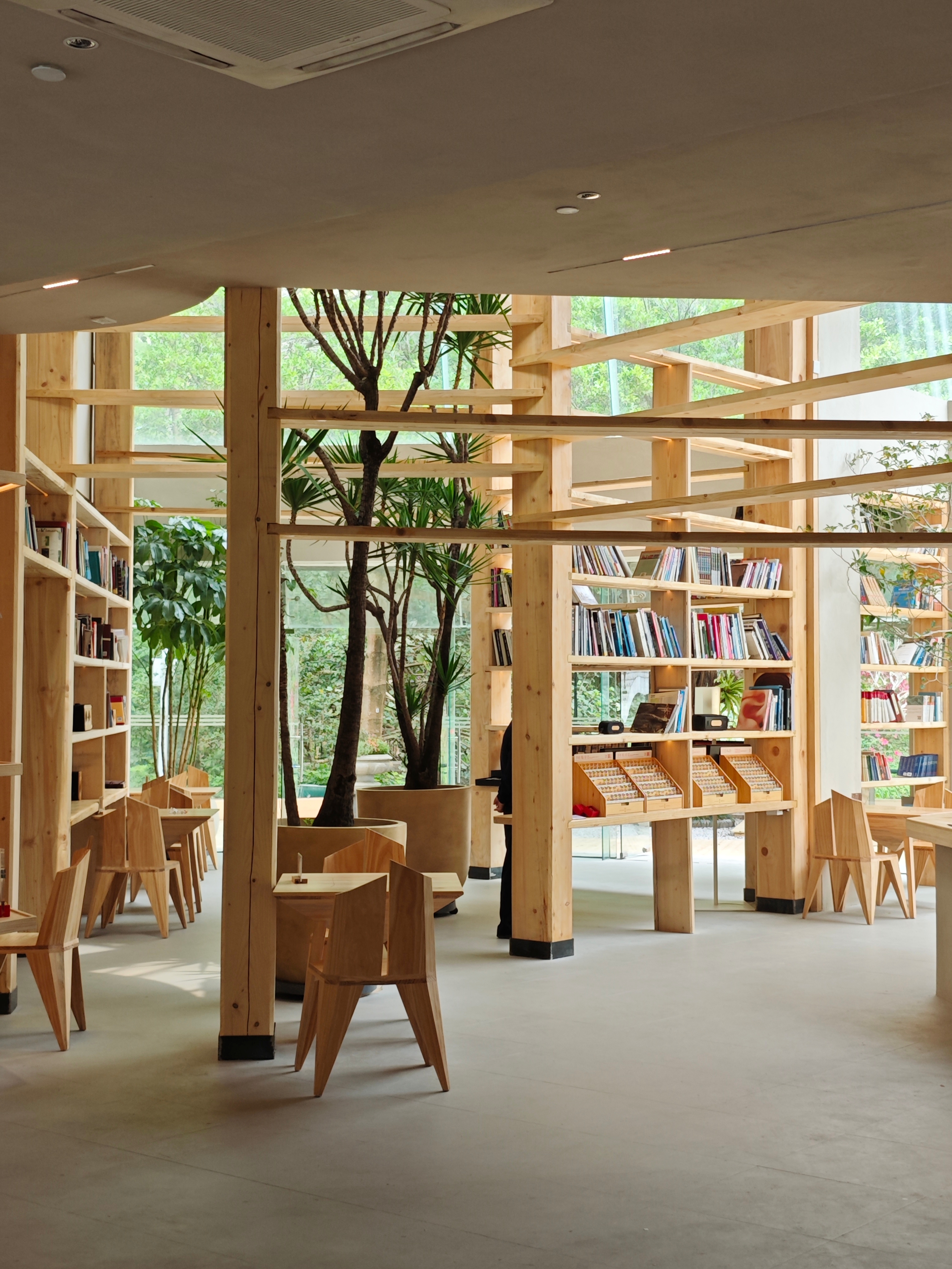 穿过笔架山公园那片满是柠檬树的林子,清新又特别的香气扑面而来,循着这香气,不用走多远,枝与松艺术书吧就出现在眼前啦。 桉与松艺术书吧是一整栋筒行的玻璃房,砖红色的外墙,在阳光下洋溢着温暖而热烈的气息,室外阅读区更是别致,小桥下流水潺潺,树影随着风轻轻摇曳,尽享自然之趣。 书吧里还有白噪音机器,不同区域摆放了多个白噪音机器,稍靠近,耳边便能听到采集到的自然之声。 捧一卷书阅读,明媚的阳光从窗外照进来,如融化的蜜糖,缓缓流淌在书页上,伴着耳边的潺潺流水声,心头的浮躁都被书香抚平。 地址:福田区笔架山公园展览馆