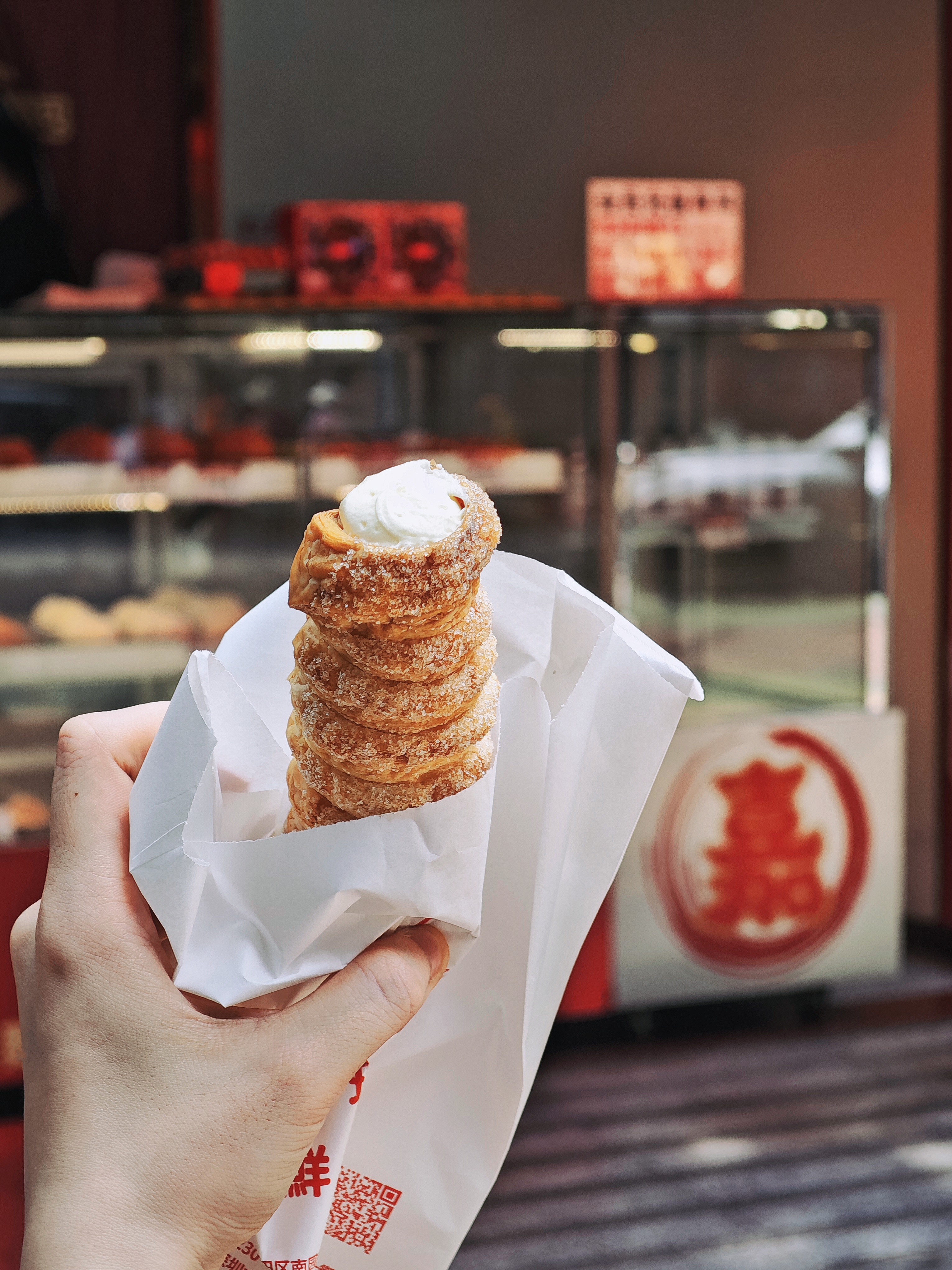 偶然发现的嘉嫂面包太对味了!满满港风的小店,面包都是现烤的,刚出炉时蓬松柔软,香气能把整条街都叫醒。特别是那个丹麦奶筒,点单后现灌奶油,外皮酥脆到掉渣,奶油多到爆满却甜而不腻,吃一个能开心一整天~
