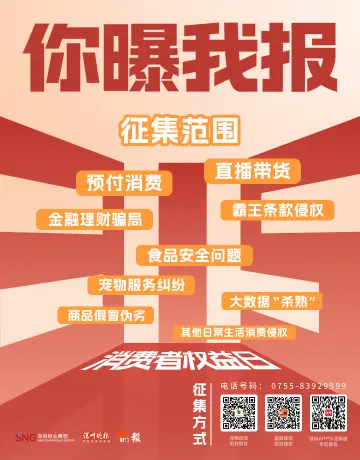 在3·15国际消费者权益日来临之际,深圳报业集团都市融媒中心所属深圳晚报、晶报发布2026年“3·15”消费线索征集令,面向广大市民及业内人士征集消费领域问题线索,为消费者发声。 市民朋友如在日常消费中遭遇不法商家欺诈或不公待遇,遇到不合理的消费问题,皆可向本报报料。期待广大市民积极参与,携手揪出消费乱象,共同维护深圳诚信有序的消费环境。 【本期话题】#315你曝我报# 【活动时间】即日起-3月15日 【参与方式】带话题发布相关文字、照片或视频内容即可参加活动