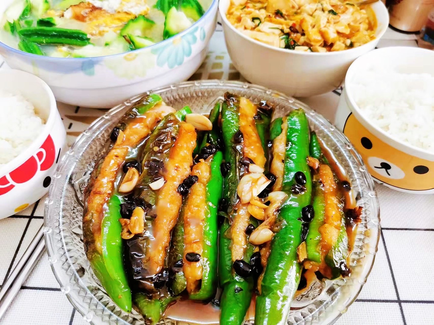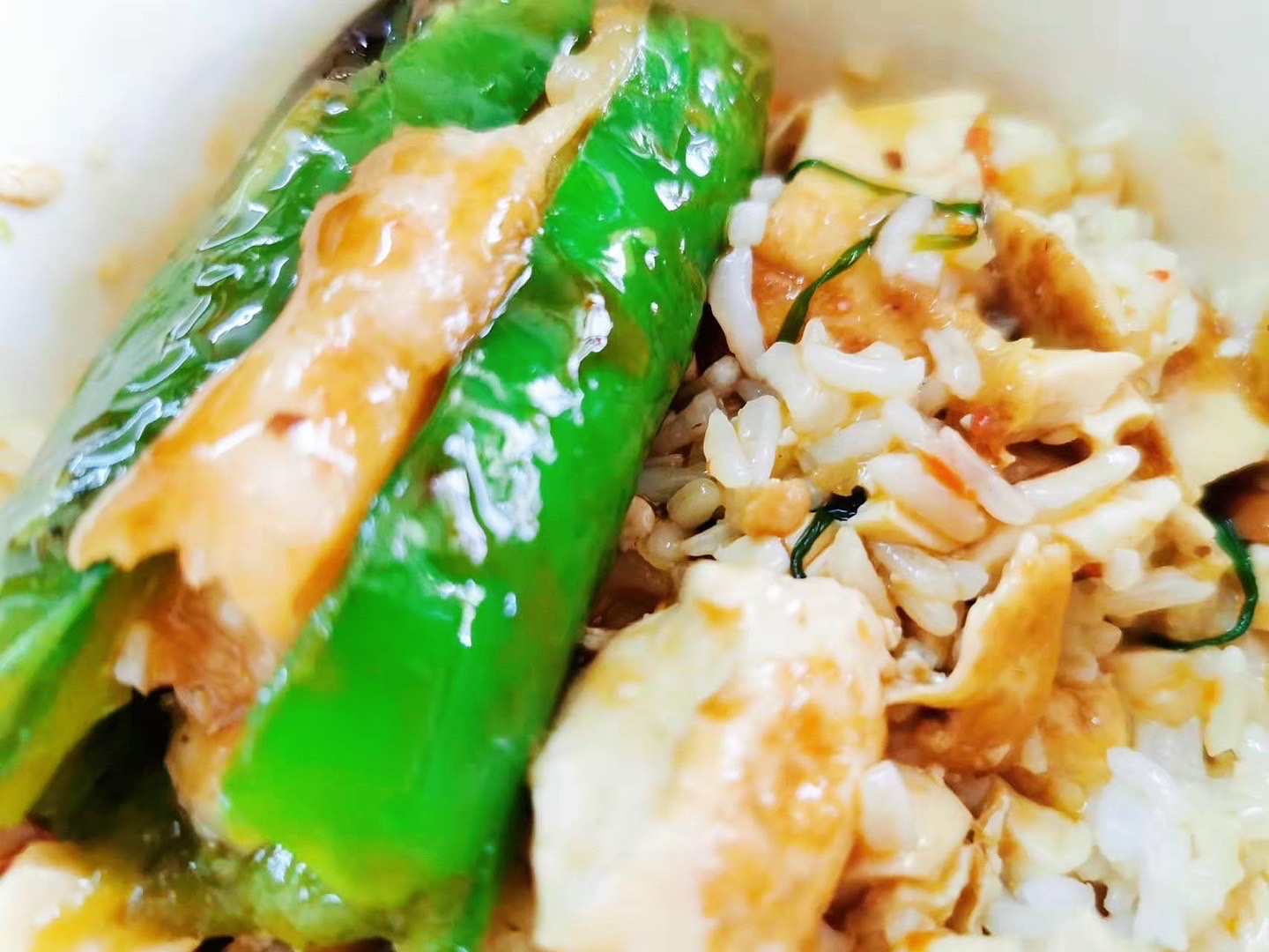 【温情煮意|特色风味粤菜:煎酿辣椒】#鹏城金秋 情意"棉棉"#【温情煮意】#绿叶居#温情煮意#家常菜#你的坚持终将美好#愿所有人平安健康 ❤🍀20121202小情人说请为娘饮早茶,🉑为娘忙不过来,不想浪费路上乘车和轮候等位的时间。但再忙,也快速下厨,做点吾儿喜欢吃的家常菜。 两菜一汤,白米饭,没得任装哦*^o^* 酿辣椒🌶️🌶️是广东人餐桌上常见的菜品(煎酿三宝之一),也是比较有特色和风味独特的下饭菜。煎酿辣椒和麻婆豆腐,在这个干燥天气容易上火,加一个清热化痰、凉血解毒的丝瓜汤,完美搭配——适合自己和家人的,就是更好的! 正所谓:食无定味(定位),适口者珍!普普通通的家常菜,有家的味道,亲情的味道,也是用心烹饪出来的妈妈的味道、幸福的味道! 感恩生活,感恩美食——这世界,唯爱与美食,不可辜负!🍀❤ 2021.12.3🍀羊羊于爱与光中
