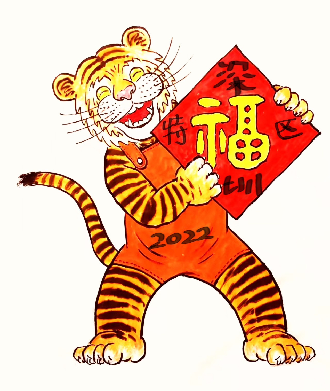 #手绘鹏城新年#虎年过年必须有虎,也有福,更是深圳特区有福啦,手绘虎身穿2022服装,笑脸拿着福字,祝福深圳特区呢