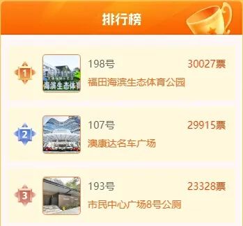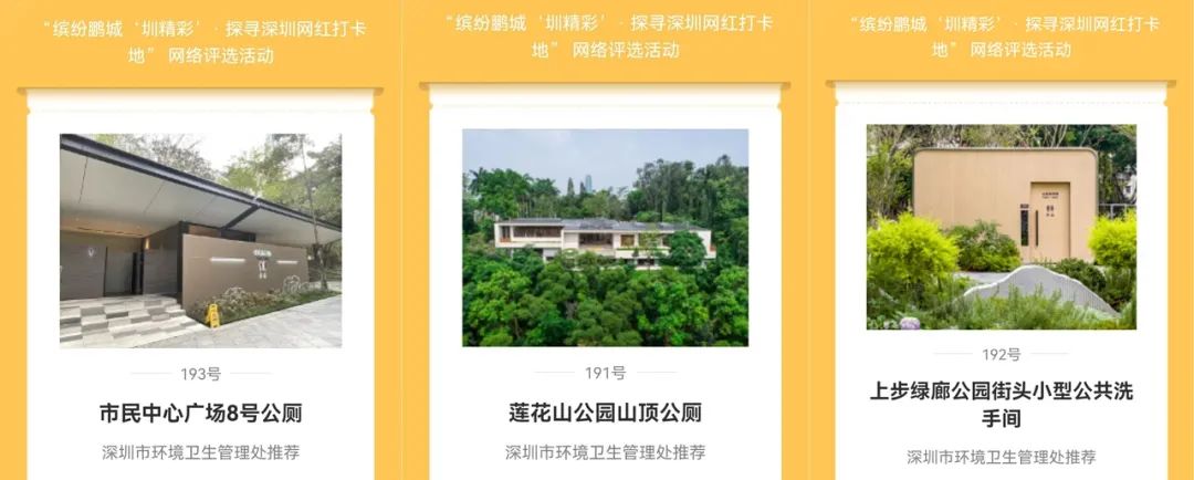 其中有三处公厕入围,分别是市民中心广场8号公厕、莲花山公园山顶公厕、上步绿廊公园街头小型公共洗手间。截至5月13日20时,213个打卡地总票数已超103万,市民中心广场8号公厕暂列第3,票数23328。