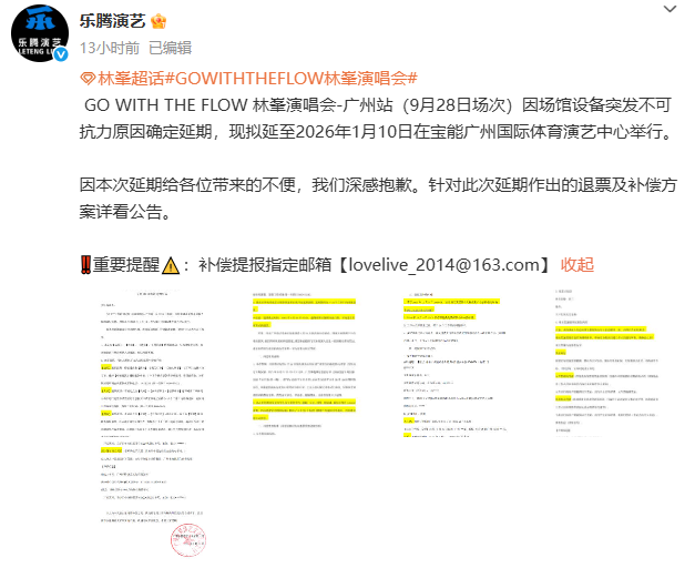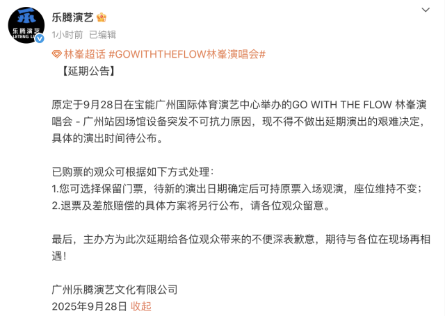 9月28日晚间,乐腾演艺发布公告:GO WITH THE FLOW 林峯演唱会-广州站(9月28日场次)因场馆设备突发不可抗力原因确定延期,现拟延至2026年1月10日在宝能广州国际体育演艺中心举行。凡是在猫眼、大麦、携程、票星球购票的观众可选择保留门票,在新的演出日期持原票入场观演,座位维持不变。
