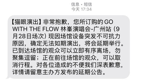 9月28日下午,距离GO WITH THE FLOW 林峯演唱会广州站第二场开演仅剩一个半小时,主办方乐腾演艺突发公告,宣布该场演唱会“因场馆设备突发不可抗力原因,现不得不做出延期演出的艰难决定,具体的演出时间待公布”。