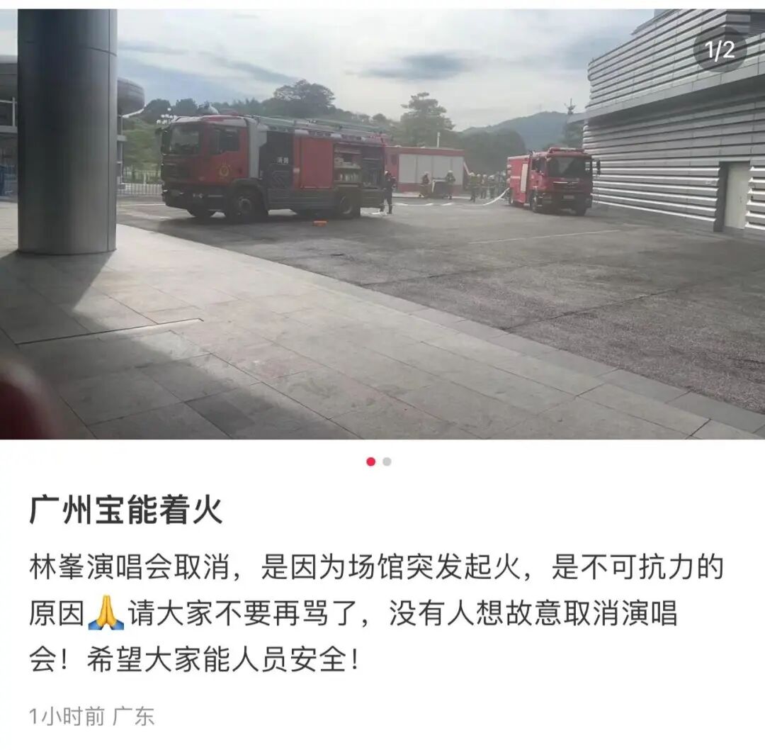 与此同时,有已经到达宝能广州国际体育演艺中心的观众在社交平台上反映,场馆现场疑似发生火灾,看到有消防车到场,并有消防员正在作业。还有不少提前到达现场或已经出发的歌迷在收到消息后表示惊讶和遗憾,也十分关心后续的处理方案。