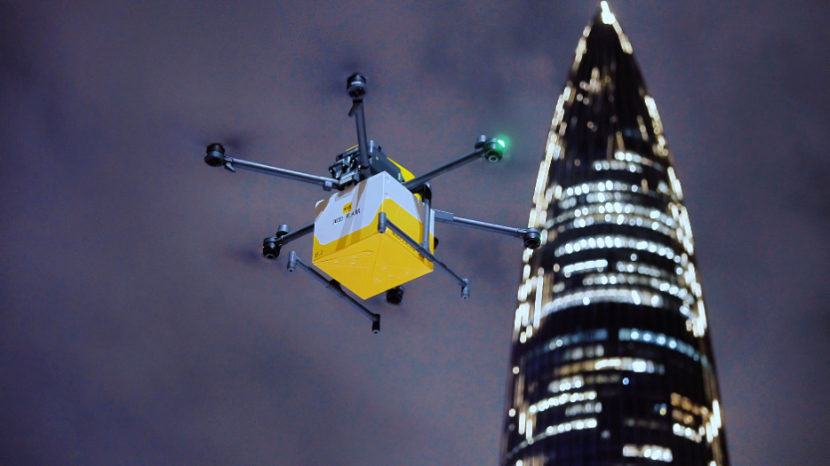 ▲美团无人机正在完成夜间配送工作(王欣 摄)