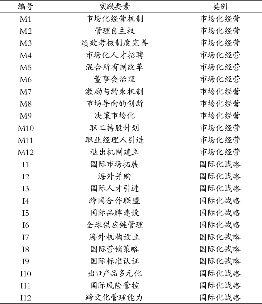第三,实践要素的分类及依据。为了在后续分析中直观呈现各种要素所属的改革方向,课题组再对24个条目进行编号与分类:凡聚焦内部市场机制、旨在提升企业活力与运营效率的条目,一律归入“市场化经营”类别并以M1—M12记号标示。涉及资源全球化配置、海外市场布局与国际竞争力提升的条目,则进入“国际化战略”类别并以I1—I12编码。如此分类体系不仅与文献共识保持一致——即市场规则内生化与国际舞台深度参与是国企转型的两条平行主轴——也为后续层次分析法的权重测算提供了清晰的层级结构,从而保证了研究路径的逻辑连贯性与结论的可追溯性。